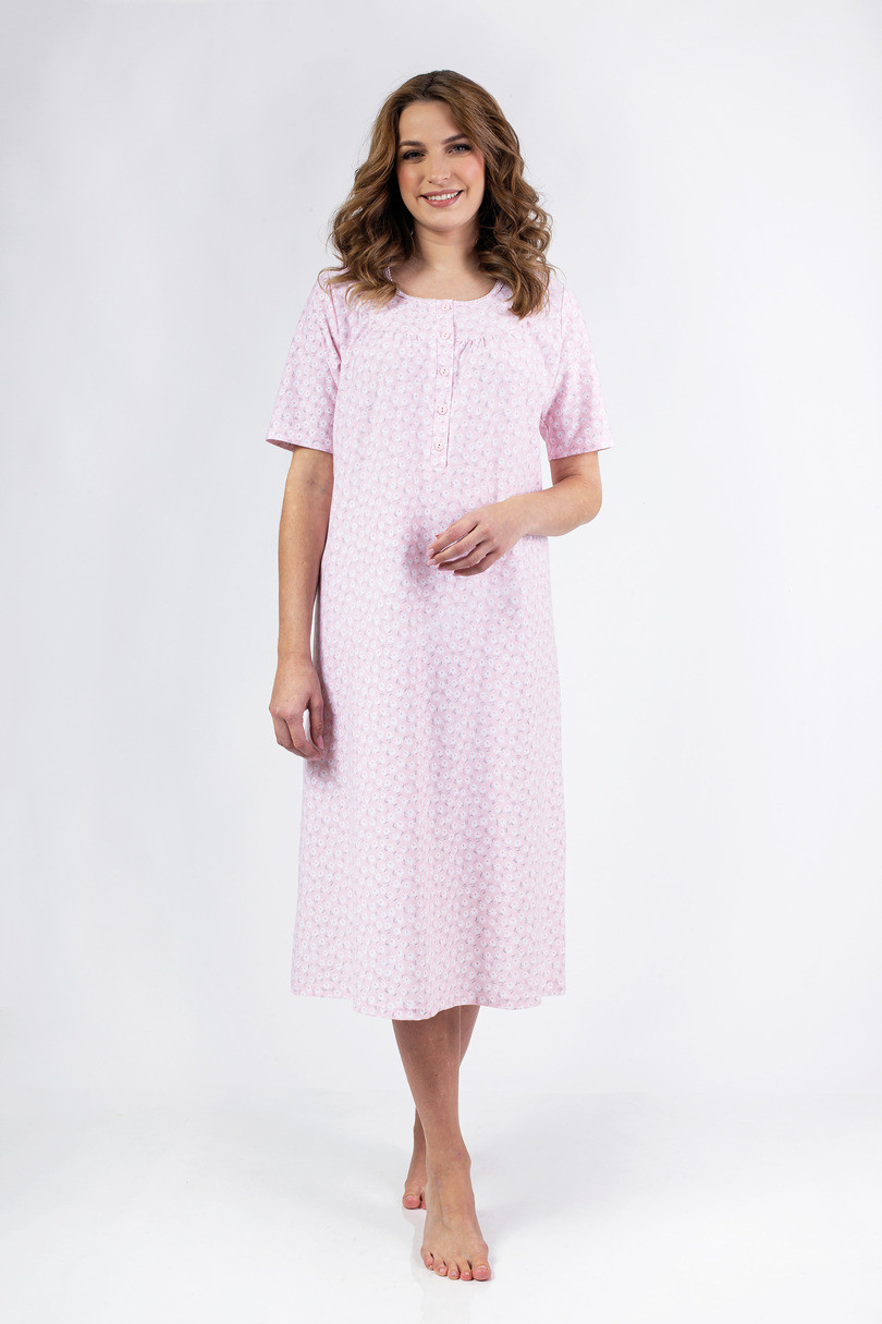 Dámská košile z jemné vzorované bavlny. Krátký rukáv, mírně nařasený výstřih, zapínání na knoflíky. Délka ke kolenům. Složení: 100% bavlna