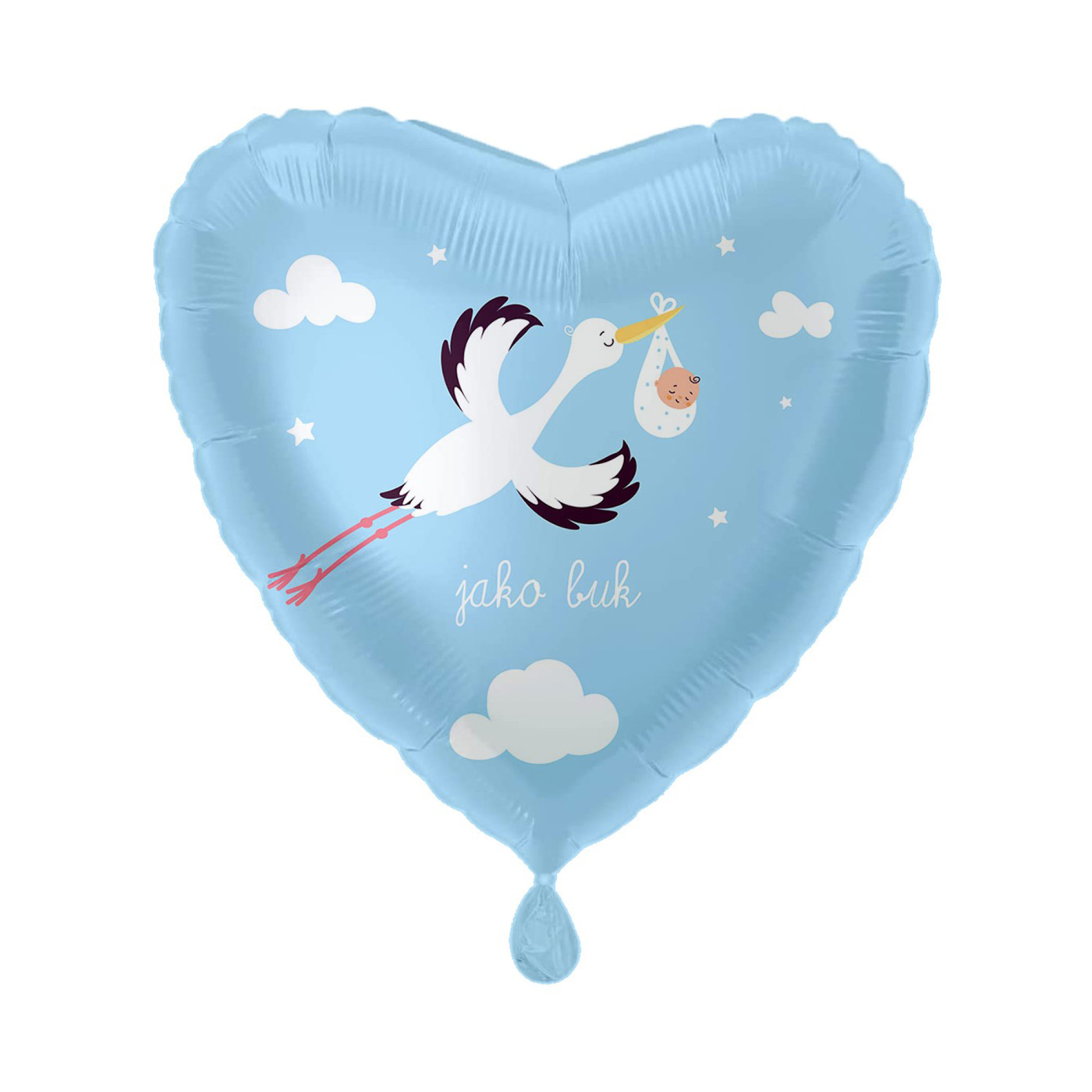 Fóliový balónek ve tvaru srdce s roztomilým potiskem čápa a uvítacím nápisem je ideálním doplňkem výzdoby při oslavě narození chlapečka. Velikost/rozměr: 17" – 43 cm Materiál: fólie Balení obsahuje: 1 ks balónku Balónek je možné nafukovat vzduchem i heliem.