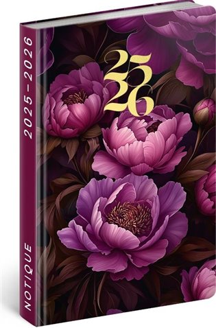 Elegantní a praktický diář s pevnými deskami s motivem fialových květů a kalendáriem na 18 měsíců.