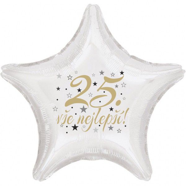 25. narozeniny balónek hvězda Fóliové balónky nabízíme v různých tvarech a barvách. Jsou sice dražší než klasické latexové balónky, ale jejich výhodou je kvalita a nepropustnost. Fóliové balónky nafouknuté vzduchem Vám vydrží několik měsíců bez výrazných změn. V případě, že fóliový balónek nafouknete heliem, můžete počítat s dobou létání přibližně 3-7 dní, přičemž létání balónků ovlivňuje okolní teplota i objem samotného balónku. Balónek má samouzavíratelný ventil, který ihned po nafouknutí zamezí úniku vzduchu popř. helia. Při nafukování vzduchem používejte prosím ruční pumpu popř. brčko na pití. Inspiraci pro Vaší dekoraci najdete na internetovém magazínu www.party-narozeniny.cz Velikost nabízených balónků je 42 cm.Je možné nafukovat heliem i vzduchem. Objem 13 litrů. POZOR!!! Všechny námi nabízené fóliové balónky mají samouzavíratelný ventil. V případě nafukování vzduchem, nafukujte ruční pumpou. Po nafouknutí se balonky samy uzavřou. Je možné je taky průběžně přes uzavíratelný ventil dofukovat.