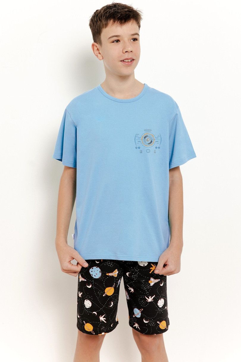 Letnie noce mogą być jeszcze przyjemniejsze dzięki piżamie chłopięcej Spencer, wykonanej w 100% z miękkiej, oddychającej bawełny. Koszulka z krótkim rękawem w kolorze niebieskim ozdobiona jest subtelnym nadrukiem na piersi, który dodaje jej nowoczesnego charakteru. Do kompletu dołączone są krótkie spodenki z efektownym nadrukiem w kosmiczne motywy – planety, rakiety i astronautów. To doskonały wybór dla młodych miłośników przygód i wygody! Piżama pakowana w foliowy woreczek – idealna na prezent lub wyjazd. Skład: 100% Bawełna