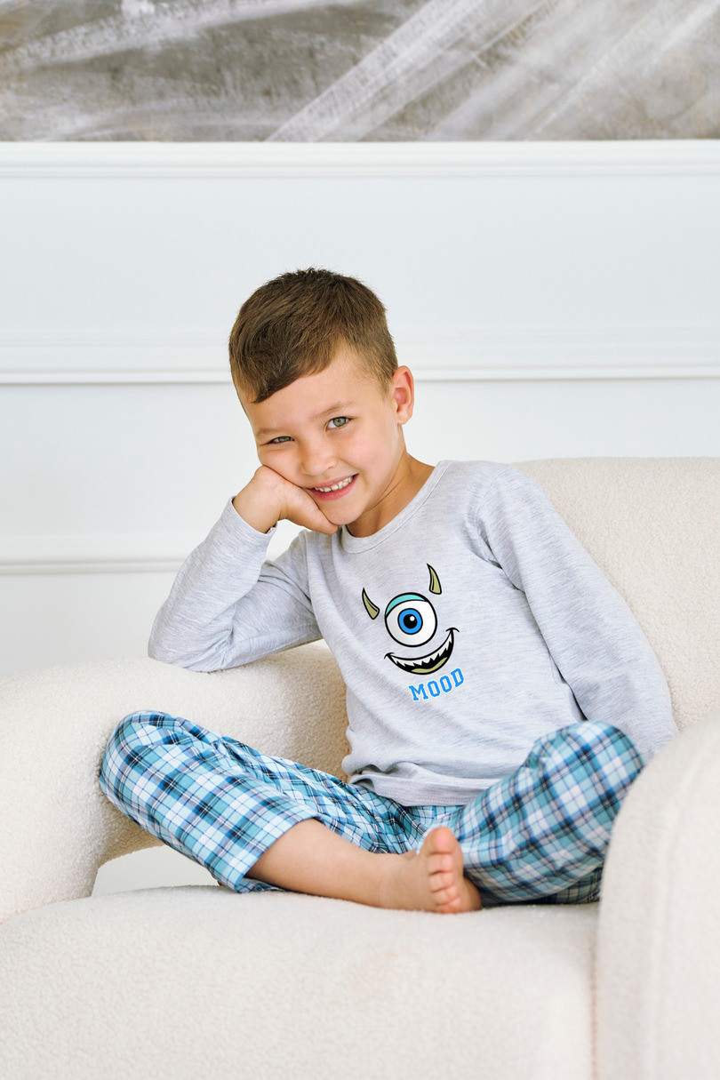 Chlapecké pyžamo 3499 Joel je pohodlná souprava vyrobená výhradně z přírodní, prodyšné bavlny. Tričko s dlouhým rukávem má na přední straně barevný, hravý potisk, který dodává celé soupravě veselý charakter a bude se líbit i těm nejmenším. Dlouhé kalhoty v klasickém kostkovaném vzoru mají pohodlný elastický pas, který zajišťuje dokonalé přizpůsobení a volnost pohybu. Díky měkkému, k pokožce šetrnému materiálu je toto pyžamo ideální volbou na spaní i domácí odpočinek. Model je k dispozici ve velikostech 92-116, které jsou ideální pro mladší chlapce..