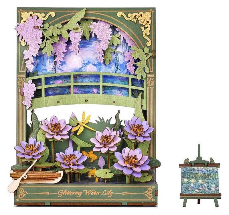 Užijte si netradiční ztvárnění klasických Monetových maleb prostřednictvím 3D skládačky. Třpytivé lekníny vytvoří po sestavení kouzelnou dekoraci s příjemným teplým osvětlením, která ozdobí každý interiér. Celá scenérie s detailně propracovanými květinami, loďkou a dřevěným můstkem navodí atmosféru klidu a pohody. Decentní LED podsvícení dodává dekoraci magickou atmosféru a připomíná hru světla při západu slunce, tolik typickou pro Monetova díla. Složenou scenérii můžete využít jako noční světlo, doplněk do knihovny nebo originální dárek pro každého, kdo má rád umění a tvoření. 3D skládačka je skvělý způsob, jak si užít kreativní a edukativní hraní a zároveň vytvořit nádherný model květiny, který se může stát netradičním dárkem či ozdobou Vašeho domova či kanceláře. Skládání podporuje rozvoj jemné motoriky, prostorového myšlení a trpělivosti. Je to možnost, jak kombinovat zábavu se vzděláváním. Skládačka je dodávána v nesloženém stavu, zabalená v krabici s podrobným návodem k sestavení. Hlavní vlastnosti: doba skládání 2 hodiny LED osvětlení 2x baterie AAA/LR03/AM4 1,5 V (nejsou součástí balení) nízká obtížnost sestavení bez použití lepidla výjimečný a realistický vzhled vhodné pro děti i dospělé rozvíjí logické a motorické dovednosti podporuje trpělivost dětí ideální dárek nebo jedinečná dekorace Rozměry po sestavení: 16,5 x 8 x 21,5 cm Rozměry balení: 31,5 x 23,7 x 0,5 cm Věk: 14+ Materiál: dřevo, papír Počet dílků: 237 Doba sestavení: 2 hod Napájení: 2x baterie AAA/LR03/AM4 1,5 V (nejsou součástí balení)