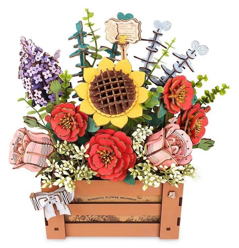 Vytvořte nadčasovou dekoraci nebo netradiční dárek pro všechny milovníky květin. Poskládejte pestrobarevné květiny a naaranžujte je do dřevěného truhlíku. Tyto květiny neuvadnou ani nevyblednou a budou se krásně vyjímat na okně nebo polici. Pestrá kytice se skládá ze slunečnice, růžové růže, červené kamélie, levandule a šeříku a zelených rostlin. Každá květina má symbolický význam: slunečnice vyjadřuje pozitivitu, levandule je uklidňující, červená kamélie zase vášnivá, růžová růže je symbolem vděčnosti. 3D skládačka je skvělý způsob, jak si užít kreativní a edukativní hraní a zároveň vytvořit nádherný model, který se může stát netradičním dárkem či ozdobou interiéru. Skládání 3D skládačky podporuje rozvoj jemné motoriky, prostorového myšlení a trpělivosti. Je to možnost, jak kombinovat zábavu se vzděláváním. Všechny dílky jsou přesně vyřezané laserem a lehce do sebe zapadnou, aby výsledek byl stabilní a odolný. Truhlík je opatřen otvory pro ukotvení květin, aby Vaše aranžmá drželo Vámi vytvořený tvar. Skládačka je dodávána v nesloženém stavu, zabalená v krabici s podrobným návodem k sestavení. Obsah balení: dřevěný truhlík, 1 slunečnice, 1 šeřík, 1 červená kamélie, 1 růžová růže, 1 eukalyptus, 1 levandule, doplňující dekorativní rostliny, mašlička, kartička s možností napsání textu. Hlavní vlastnosti: •658 dílků •doba skládání 2,5 hod •sestavení bez použití lepidla •atraktivní a realistický vzhled •vhodné pro děti i dospělé •rozvíjí logické a motorické dovednosti •podporuje trpělivost dětí •ideální jako dárek nebo jedinečná dekorace Rozměry balení: 31,5 x 23,7 x 8 cm Rozměry po sestavení: 28 x 14 x 28 cm Věk: 14+ Materiál: dřevo, plast Doba sestavení: 2,5 hod Počet dílků: 658