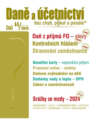 <p>Novelou zákona o daních z příjmů s účinností od 1. 1. 2024 došlo k změnám ohledně slev na dani. O jak vysoké slevy se jedná, jak správně postupovat v případě Kontrolních hlášení v roce 2024 a nebo jaké jsou podmínky Stravování zaměstnanců? I na další otázky z daňového hlediska upozorňují články Nezdanitelné části základu daně, Pracovní oběd a občerstvení na pracovišti, Dodání vody a tepla a DPH, Benefitní karty – vznik nepeněžního příjmu…</p>