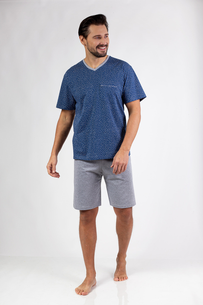 Klasické pánské pyžamo s krátkým rukávem z kvalitní bavlny, se vzorovaným tričkem s výstřihem a jednobarevnými kalhotami s krátkými nohavicemi. Složení: 100% bavlna .