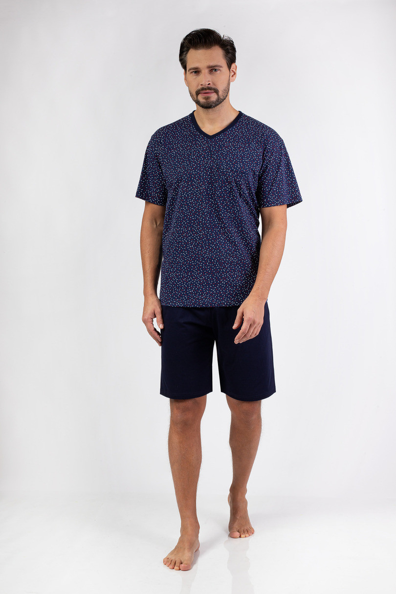 Klasické pánské pyžamo s krátkým rukávem z kvalitní bavlny, se vzorovaným tričkem s výstřihem a jednobarevnými kalhotami s krátkými nohavicemi. Složení: 100% bavlna .