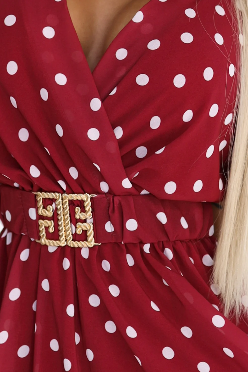 Bordó hrachové šaty s obálkovým výstřihem - styl Marilyn | Numoco Basic Bordóšaty ve stylu Marilyn Monroes bílými puntíky jsou kvintesencí ženskosti a nadčasové elegance. Jsou vyrobeny z lehkého, vzdušného materiálu, krásně padnou v pohybu a vytvářejí smyslnou a romantickou siluetu. Obálkový výstřih decentně zvýrazňuje poprsí, zatímco pružný pas s ozdobným páskem odhaluje ženské křivky. Rozhalený střih je ideální na letní výlety, romantické procházky, rande, zahradní party nebo svatbu. Šaty Numoco Basic, vyrobené v Evropě, kombinují retro styl s moderním pohodlím. ✅ Retro styl inspirovaný Marilyn Monroe ✅ Hrášek - módní a nadčasový vzor ✅ Rozšířený střih a lehká tkanina ✅ Obálkový výstřih a ozdobný pásek ✅ Značka Numoco Basic - evropská výroba Smyslné vínové šaty s bílými puntíky s obálkovým výstřihem a rozšířeným střihem. ideální na léto - lehké, ženské a plné retro šarmu. značka Numoco Basic - evropská výroba. Míry jsou měřeny naplocho - první rozměr je před, druhý po natažení látky (+/- 2 cm)Modelka na obrázku měří 165 cm a má na sobě velikost UNI (S - XXL) Rozměry: UNI Od pasu k pasu(A) 42 - 62 Pas(B) 30 - 60 Boky(C) 42 - 75 Délka od podpaží(D) 76 Délka od ramene(E) 104 materiál: 95% polyester, 5% elastan Podšívka: 95% viskóza, 5% elastan