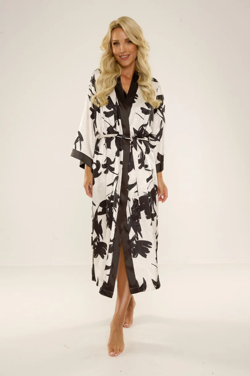 Elegantní vzdušný dámský župan vázaný v pase ušitý z jemného saténu. Délka rukávu 7/8. Složení: 97% polyester 3% elastan