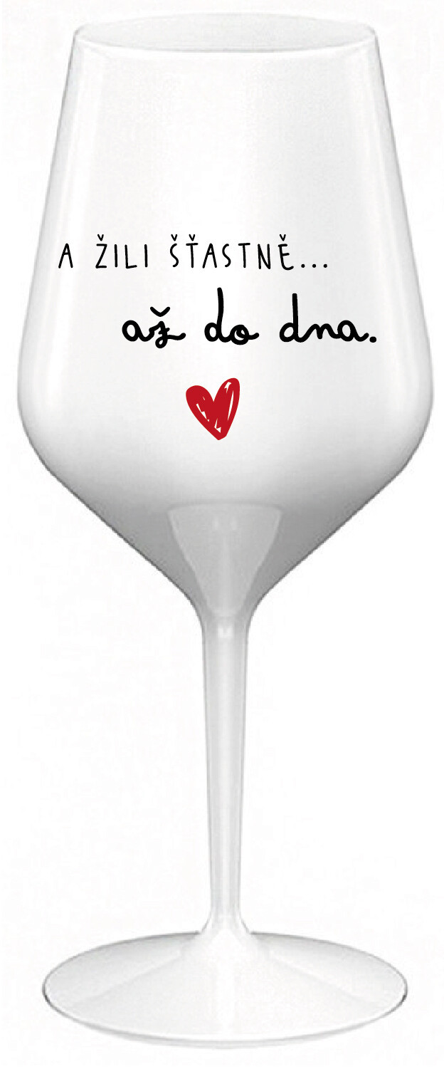 Nerozbitná bílá vinná sklenice s motivem A ŽILI ŠŤASTNĚ AŽ DO DNA je skvělá na zahradu, pláž, výlet, piknik a parádu udělá i při kempování. Jelikož je vyrobená z kvalitního polykarbonátu je de facto nerozbitná. Je to luxusní kousek, s nímž si víno můžete vychutnat prostě kdekoliv. Mají ergonomický tvar, který příjemně padne do ruky a protože je lehká, usnadňuje to její přenášení. Je snadno skladovatelná a lehce se čistí. Díky svému designu si s ní můžete vychutnat doopravdy kdekoliv bezproblémové pití výborného vína. Materiál PP. Vyrobené s láskou v ČR