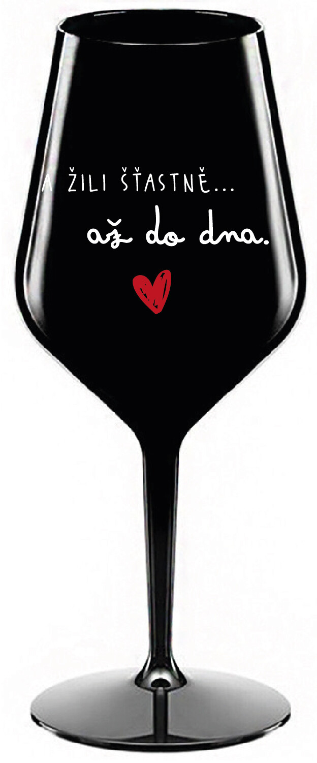 Nerozbitná černá vinná sklenice s motivem A ŽILI ŠŤASTNĚ AŽ DO DNA je skvělá na zahradu, pláž, výlet, piknik a parádu udělá i při kempování. Jelikož je vyrobená z kvalitního polykarbonátu je de facto nerozbitná. Je to luxusní kousek, s nímž si víno můžete vychutnat prostě kdekoliv. Mají ergonomický tvar, který příjemně padne do ruky a protože je lehká, usnadňuje to její přenášení. Je snadno skladovatelná a lehce se čistí. Díky svému designu si s ní můžete vychutnat doopravdy kdekoliv bezproblémové pití výborného vína. Materiál PP. Vyrobené s láskou v ČR