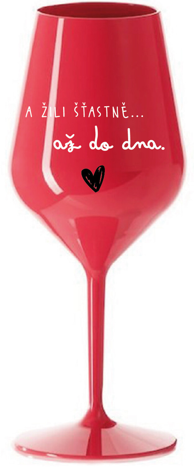 Nerozbitná červená vinná sklenice s motivem A ŽILI ŠŤASTNĚ AŽ DO DNA je skvělá na zahradu, pláž, výlet, piknik a parádu udělá i při kempování. Jelikož je vyrobená z kvalitního polykarbonátu je de facto nerozbitná. Je to luxusní kousek, s nímž si víno můžete vychutnat prostě kdekoliv. Mají ergonomický tvar, který příjemně padne do ruky a protože je lehká, usnadňuje to její přenášení. Je snadno skladovatelná a lehce se čistí. Díky svému designu si s ní můžete vychutnat doopravdy kdekoliv bezproblémové pití výborného vína. Materiál PP. Vyrobené s láskou v ČR