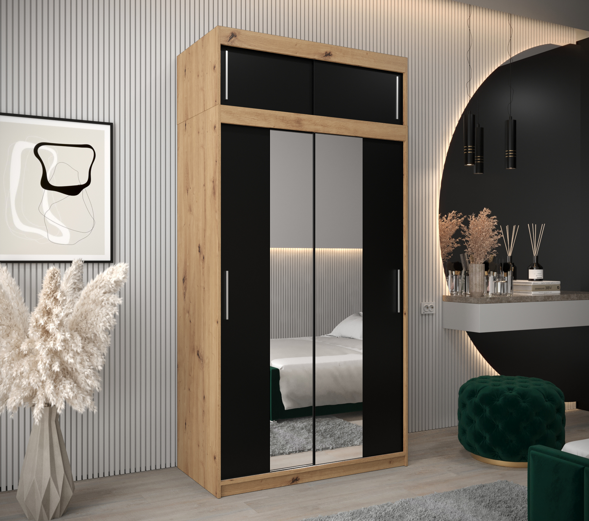 Domů Nábytek Ložnice Skříně a komody Šatní skříně Šatní skříň Abi T1 s nástavcem Barva korpusu: Dub artisan, Rozměry: 120 cm, Dveře: Černá