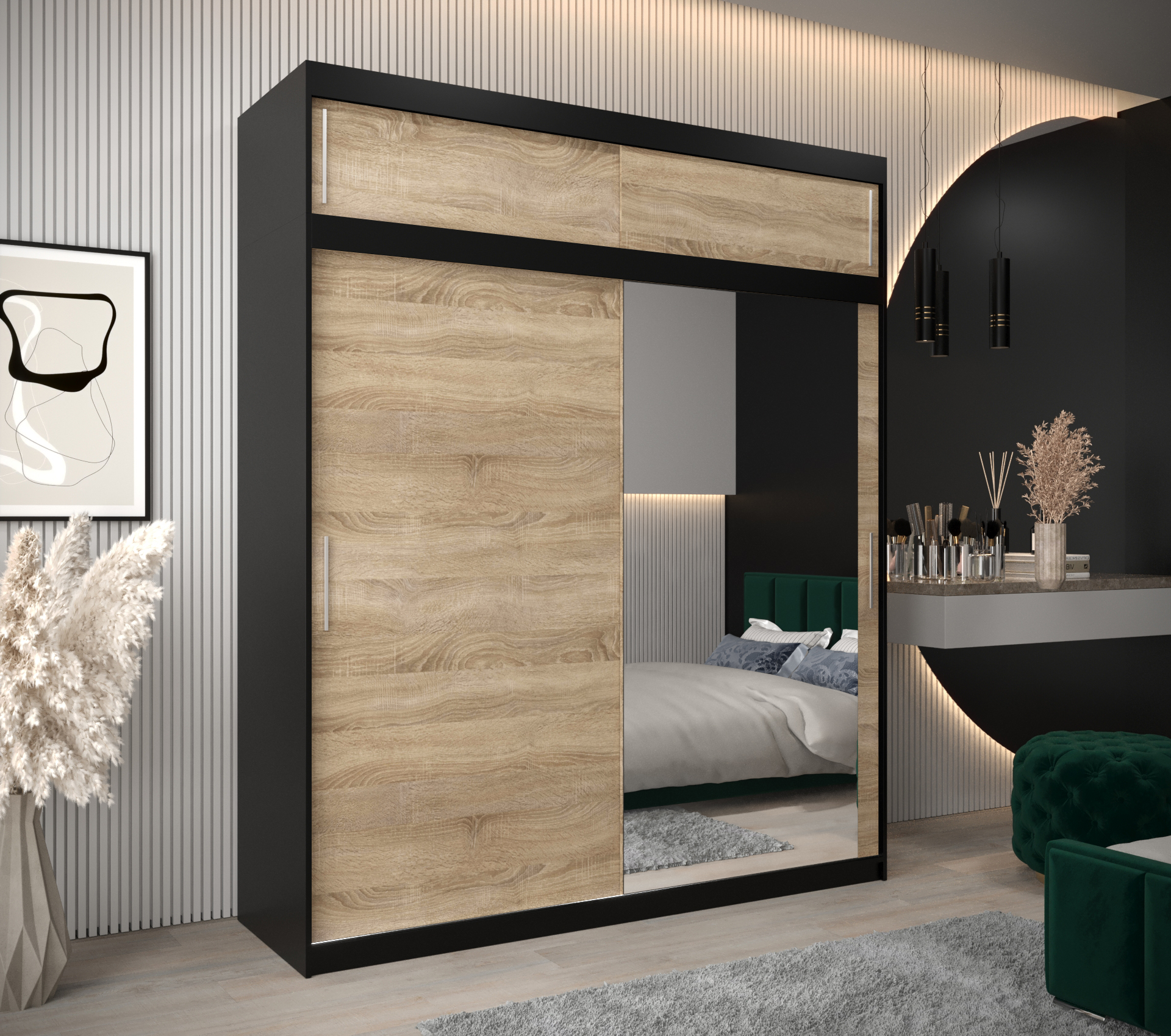 Šatní skříň Abi T2 s nástavcem Hledáte moderní šatní skříň s posuvnými dveřmi, která vás okouzlí svým originálním vzhledem? Nehledejte nic jiného než šatní skříň Abi T2 s nástavcem! Šatní skříň nabízí velký úložný prostor a kvalitu. Můžete si vybrat z několika velikostí a barev, takže se skříň přizpůsobí vašim potřebám. • Vlastnosti šatní skříně Korpus a posuvné dveře Korpus a dveře jsou vyrobeny z kvalitní laminované dřevotřískové desky o síle 16 mm. PVC hrany Hrany desek jsou opatřeny PVC dýhou o síle 0,5 mm Zrcadlo Šatní skříň je se zrcadlem. Úchyty K otevření šatní skříně vám poslouží plastové stříbrné úchyty. Vnitřní uspořádání Základem vnitřního uspořádání jsou dvě šatní šatní a police - lze si dokoupit zásuvky. • Barevné varianty: Šatní skříň Abi T2 s nástavcem je dostupná v dekorech a barvách dub artisan, dub sonoma, černá a bílá. Všechny tyto odstíny lze vzájemně kombinovat. dub artisan dub sonoma černá bílá • Rozměry 240 cm celková výška 6 rozměrů celková šířka 62 cm celková hloubka 16 mm tloušťka desky 6 rozměrů šířka 100 cmšířka 120 cmšířka 150 cmšířka 180 cmšířka 200 cmšířka 250 cm Detailní rozpis jednotlivých balíků při přepravěV odkazu níže naleznete podrobnosti týkající se počtu balíků, jejich rozměry a váhuRozpis jednotlivých balíků • ZásuvkyPraktické rozšíření univerzální a stylové skříně Abi o nástavec se zásuvkami. Elegantní rozšíření se dvěma, nebo od šířky 180 cm, dokonce se čtyřmi šuplíky je ideální pro rozšíření skříně o další úložný prostor. Barevné provedení zásuvek je stejné jako korpus šatní skříně. vnitřní uspořádání do šířky 150 cm rozšíření o šuplíky u šířky do 150 cm vnitřní uspořádání od šířky 180 cm rozšíření o šuplíky od šířky 180 cm • Další modely šatních skříní z řady AbiZaujala Vás tato šatní skříň, ale představovali by jste si jiný rozměr, barevnou kombinaci nebo variantu zrcadla? Jedním kliknutím na odkaz níže se vám nabídnou další šatní skříně. A další výhodou těchto šatních skříní je i možnost dokoupení nástavců. Zobrazit další modely... • Další součásti ložniceVybavujete nový byt nebo chcete obměnit svůj stávají nábytek v ložnici? Postel je středem veškerého dění v místnosti. V naší nabídce naleznete veškeré komponenty ložnice.Zobrazit další nábytek.... • Upozornění Odstíny prezentované na fotografiích jsou ilustračním materiálem, barvy se mohou lišit od vyobrazení na fotografiích podle nastavení vašeho zobrazovacího zařízení. Zboží dodáváme vlastní dopravou! Zboží rozvážíme také o víkendu. Dodáváme v demontu s podrobným instruktážním návodem. Objednat si také můžete naše doplňkové služby jako je montáž na místě, výnos do patra a nebo ekologickou likvidaci starého nábytku. Zájem o služby přidejte do košíku v objednávce. Ceník doplňkových služeb - výnos, ekolikvidace a montáž Montáž na místě Pokud se nechcete trápit s montáží, rádi Vám sestavíme nábytek na místě Výnos až do bytu Nechcete se tahat se zakoupeným zbožím? Rádi vám nábytek vyneseme až do bytu. Doprava Paul nábytek Zboží vám dopravíme až k domu naší vlastní dopravou, aby nedošlo k poškození cizím dopravcem. Ekologická likvidace Pokud si přejete, můžeme odvést starý nábytek a ekologicky jej nechat zlikvidovat. Zboží dodáváme po celé České republice! Dodáváme v demontu s podrobným instruktážním návodem. Objednat si také můžete naše doplňkové služby jako je montáž na místě, výnos do patra nebo ekologickou likvidaci starého nábytku. Požadované služby přidejte do košíku v objednávce. Montáž na místě Pokud se nechcete trápit s montáží, rádi Vám sestavíme nábytek na místě Výnos až do bytu Nechcete se tahat se zakoupeným zbožím? Rádi vám nábytek vyneseme až do bytu. Doprava ČR Zboží vám dopravíme až k domu za první uzamykatelné dveře po celé České republice. Ekologická likvidace Pokud si přejete, můžeme odvést starý nábytek a ekologicky jej nechat zlikvidovat. Ceník doplňkových služeb - výnos, ekolikvidace a montáž Upozornění Produkty prezentované na fotografiích jsou ilustračním materiálem, barvy se mohou lišit od vyobrazení na fotografiích podle nastavení vašeho zobrazovacího zařízení.