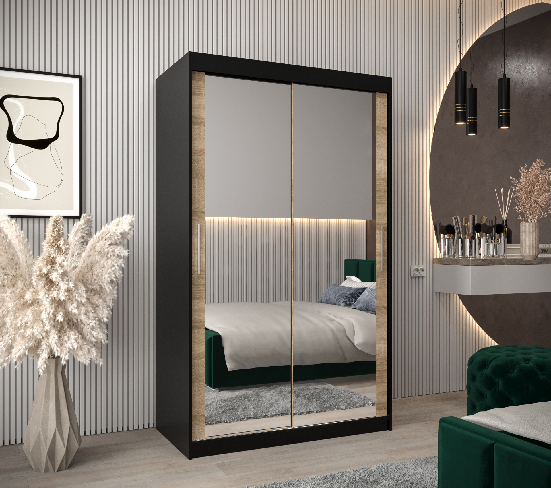 Šatní skříň Abi T3 Hledáte moderní šatní skříň s posuvnými dveřmi, která vás okouzlí svým originálním vzhledem? Nehledejte nic jiného než šatní skříň Abi T3! Šatní skříň nabízí velký úložný prostor a kvalitu. Můžete si vybrat z několika velikostí a barev, takže se skříň přizpůsobí vašim potřebám. • Vlastnosti šatní skříně Korpus a posuvné dveře Korpus a dveře jsou vyrobeny z kvalitní laminované dřevotřískové desky o síle 16 mm. PVC hrany Hrany desek jsou opatřeny PVC dýhou o síle 0,5 mm. Zrcadlo Šatní skříň je se zrcadlem. Úchyty K otevření šatní skříně vám poslouží plastové stříbrné úchyty. Vnitřní uspořádání Základem vnitřního uspořádání jsou dvě šatní šatní a police - lze si dokoupit zásuvky. • Barevné varianty: Šatní skříň Abi T3 je dostupná v dekorech a barvách dub artisan, dub sonoma, černá a bílá. Všechny tyto odstíny lze vzájemně kombinovat. dub artisan dub sonoma černá bílá • Rozměry 200 cm celková výška 6 rozměrů celková šířka 62 cm celková hloubka 16 mm tloušťka desky 6 rozměrů šířka 100 cmšířka 120 cmšířka 150 cmšířka 180 cmšířka 200 cmšířka 250 cm Detailní rozpis jednotlivých balíků při přepravěV odkazu níže naleznete podrobnosti týkající se počtu balíků, jejich rozměry a váhuRozpis jednotlivých balíků • ZásuvkyPraktické rozšíření univerzální a stylové skříně Abi o nástavec se zásuvkami. Elegantní rozšíření se dvěma, nebo od šířky 180 cm, dokonce se čtyřmi šuplíky je ideální pro rozšíření skříně o další úložný prostor. Barevné provedení zásuvek je stejné jako korpus šatní skříně. vnitřní uspořádání do šířky 150 cm rozšíření o šuplíky u šířky do 150 cm vnitřní uspořádání od šířky 180 cm rozšíření o šuplíky od šířky 180 cm • Další modely šatních skříní z řady AbiZaujala Vás tato šatní skříň, ale představovali by jste si jiný rozměr, barevnou kombinaci nebo variantu zrcadla? Jedním kliknutím na odkaz níže se vám nabídnou další šatní skříně. A další výhodou těchto šatních skříní je i možnost dokoupení nástavců. Zobrazit další modely... • Další součásti ložniceVybavujete nový byt nebo chcete obměnit svůj stávají nábytek v ložnici? Postel je středem veškerého dění v místnosti. V naší nabídce naleznete veškeré komponenty ložnice.Zobrazit další nábytek.... • Upozornění Odstíny prezentované na fotografiích jsou ilustračním materiálem, barvy se mohou lišit od vyobrazení na fotografiích podle nastavení vašeho zobrazovacího zařízení. Zboží dodáváme vlastní dopravou! Zboží rozvážíme také o víkendu. Dodáváme v demontu s podrobným instruktážním návodem. Objednat si také můžete naše doplňkové služby jako je montáž na místě, výnos do patra a nebo ekologickou likvidaci starého nábytku. Zájem o služby přidejte do košíku v objednávce. Ceník doplňkových služeb - výnos, ekolikvidace a montáž Montáž na místě Pokud se nechcete trápit s montáží, rádi Vám sestavíme nábytek na místě Výnos až do bytu Nechcete se tahat se zakoupeným zbožím? Rádi vám nábytek vyneseme až do bytu. Doprava Paul nábytek Zboží vám dopravíme až k domu naší vlastní dopravou, aby nedošlo k poškození cizím dopravcem. Ekologická likvidace Pokud si přejete, můžeme odvést starý nábytek a ekologicky jej nechat zlikvidovat. Zboží dodáváme po celé České republice! Dodáváme v demontu s podrobným instruktážním návodem. Objednat si také můžete naše doplňkové služby jako je montáž na místě, výnos do patra nebo ekologickou likvidaci starého nábytku. Požadované služby přidejte do košíku v objednávce. Montáž na místě Pokud se nechcete trápit s montáží, rádi Vám sestavíme nábytek na místě Výnos až do bytu Nechcete se tahat se zakoupeným zbožím? Rádi vám nábytek vyneseme až do bytu. Doprava ČR Zboží vám dopravíme až k domu za první uzamykatelné dveře po celé České republice. Ekologická likvidace Pokud si přejete, můžeme odvést starý nábytek a ekologicky jej nechat zlikvidovat. Ceník doplňkových služeb - výnos, ekolikvidace a montáž Upozornění Produkty prezentované na fotografiích jsou ilustračním materiálem, barvy se mohou lišit od vyobrazení na fotografiích podle nastavení vašeho zobrazovacího zařízení.