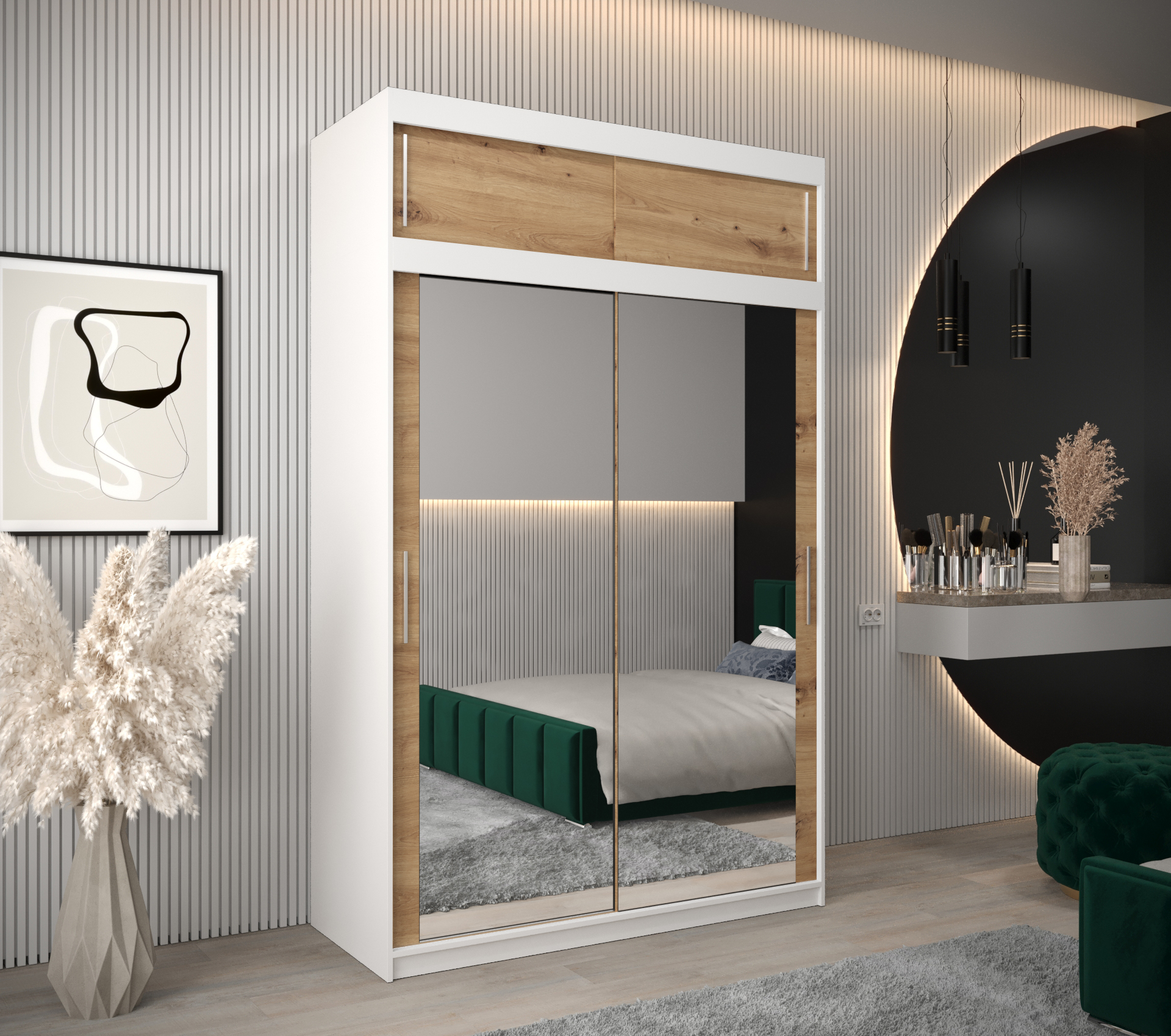 Šatní skříň Abi T3 s nástavcem Hledáte moderní šatní skříň s posuvnými dveřmi, která vás okouzlí svým originálním vzhledem? Nehledejte nic jiného než šatní skříň Abi T3 s nástavcem! Šatní skříň nabízí velký úložný prostor a kvalitu. Můžete si vybrat z několika velikostí a barev, takže se skříň přizpůsobí vašim potřebám. • Vlastnosti šatní skříně Korpus a posuvné dveře Korpus a dveře jsou vyrobeny z kvalitní laminované dřevotřískové desky o síle 16 mm. PVC hrany Hrany desek jsou opatřeny PVC dýhou o síle 0,5 mm Zrcadlo Šatní skříň je se zrcadlem. Úchyty K otevření šatní skříně vám poslouží plastové stříbrné úchyty. Vnitřní uspořádání Základem vnitřního uspořádání jsou dvě šatní šatní a police - lze si dokoupit zásuvky. • Barevné varianty: Šatní skříň Abi T3 s nástavcem je dostupná v dekorech a barvách dub artisan, dub sonoma, černá a bílá. Všechny tyto odstíny lze vzájemně kombinovat. dub artisan dub sonoma černá bílá • Rozměry 240 cm celková výška 6 rozměrů celková šířka 62 cm celková hloubka 16 mm tloušťka desky 6 rozměrů  šířka 100 cmšířka 120 cmšířka 150 cmšířka 180 cmšířka 200 cmšířka 250 cm Detailní rozpis jednotlivých balíků při přepravěV odkazu níže naleznete podrobnosti týkající se počtu balíků, jejich rozměry a váhuRozpis jednotlivých balíků • ZásuvkyPraktické rozšíření univerzální a stylové skříně Abi o nástavec se zásuvkami. Elegantní rozšíření se dvěma, nebo od šířky 180 cm, dokonce se čtyřmi šuplíky je ideální pro rozšíření skříně o další úložný prostor. Barevné provedení zásuvek je stejné jako korpus šatní skříně. vnitřní uspořádání do šířky 150 cm rozšíření o šuplíky u šířky do 150 cm vnitřní uspořádání od šířky 180 cm rozšíření o šuplíky od šířky 180 cm • Další modely šatních skříní z řady AbiZaujala Vás tato šatní skříň, ale představovali by jste si jiný rozměr, barevnou kombinaci nebo variantu zrcadla? Jedním kliknutím na odkaz níže se vám nabídnou další šatní skříně. A další výhodou těchto šatních skříní je i možnost dokoupení nástavců. Zobrazit další modely... • Další součásti ložniceVybavujete nový byt nebo chcete obměnit svůj stávají nábytek v ložnici? Postel je středem veškerého dění v místnosti. V naší nabídce naleznete veškeré komponenty ložnice.Zobrazit další nábytek.... • Upozornění Odstíny prezentované na fotografiích jsou ilustračním materiálem, barvy se mohou lišit od vyobrazení na fotografiích podle nastavení vašeho zobrazovacího zařízení. Zboží dodáváme vlastní dopravou! Zboží rozvážíme také o víkendu. Dodáváme v demontu s podrobným instruktážním návodem.  Objednat si také můžete naše doplňkové služby jako je montáž na místě, výnos do patra a nebo ekologickou likvidaci starého nábytku. Zájem o služby přidejte do košíku v objednávce.  Ceník doplňkových služeb - výnos, ekolikvidace a montáž Montáž na místě Pokud se nechcete trápit s montáží, rádi Vám sestavíme nábytek na místě Výnos až do bytu Nechcete se tahat se zakoupeným zbožím? Rádi vám nábytek vyneseme až do bytu. Doprava Paul nábytek Zboží vám dopravíme až k domu naší vlastní dopravou, aby nedošlo k poškození cizím dopravcem. Ekologická likvidace Pokud si přejete, můžeme odvést starý nábytek a ekologicky jej nechat zlikvidovat. Zboží dodáváme po celé České republice! Dodáváme v demontu s podrobným instruktážním návodem.  Objednat si také můžete naše doplňkové služby jako je montáž na místě, výnos do patra nebo ekologickou likvidaci starého nábytku. Požadované služby přidejte do košíku v objednávce.  Montáž na místě Pokud se nechcete trápit s montáží, rádi Vám sestavíme nábytek na místě Výnos až do bytu Nechcete se tahat se zakoupeným zbožím? Rádi vám nábytek vyneseme až do bytu. Doprava ČR Zboží vám dopravíme až k domu za první uzamykatelné dveře po celé České republice. Ekologická likvidace Pokud si přejete, můžeme odvést starý nábytek a ekologicky jej nechat zlikvidovat. Ceník doplňkových služeb - výnos, ekolikvidace a montáž Upozornění Produkty prezentované na fotografiích jsou ilustračním materiálem, barvy se mohou lišit od vyobrazení na fotografiích podle nastavení vašeho zobrazovacího zařízení.