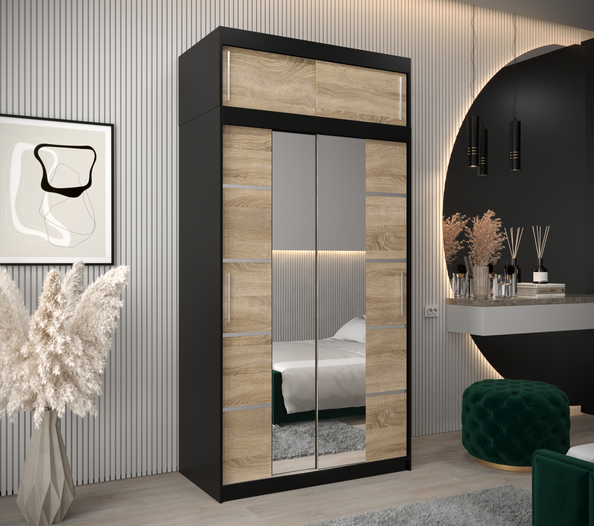 Šatní skříň Abi V4 s nástavcem Hledáte moderní šatní skříň s posuvnými dveřmi, která vás okouzlí svým originálním vzhledem? Nehledejte nic jiného než šatní skříň Abi V4 s nástavcem! Šatní skříň nabízí velký úložný prostor a kvalitu. Můžete si vybrat z několika velikostí a barev, takže se skříň přizpůsobí vašim potřebám. • Vlastnosti šatní skříně Korpus a posuvné dveře Korpus a dveře jsou vyrobeny z kvalitní laminované dřevotřískové desky o síle 16 mm. PVC hrany Hrany desek jsou opatřeny PVC dýhou o síle 0,5 mm Ozdobné pásky Posuvné dveře jsou zdobené stříbrnými plastovými pásky, které je nutno při montáži nalepit. Zrcadlo Na dveřích vám bude k dispozici leštěné zrcadlo. Úchyty k otevření šatní skříně vám poslouží plastové stříbrné úchyty. Vnitřní uspořádání Základem vnitřního uspořádání jsou dvě šatní šatní a police - lze si dokoupit zásuvky. • Barevné varianty: Šatní skříň Abi V4 s nástavcem je dostupná v dekorech a barvách dub artisan, dub sonoma, černá a bílá. Všechny tyto odstíny lze vzájemně kombinovat. dub artisan dub sonoma černá bílá • Rozměry 240 cm celková výška 6 rozměrů celková šířka 62 cm celková hloubka 16 mm tloušťka desky 6 rozměrů šířka 100 cmšířka 120 cmšířka 150 cmšířka 180 cmšířka 200 cmšířka 250 cm Detailní rozpis jednotlivých balíků při přepravěV odkazu níže naleznete podrobnosti týkající se počtu balíků, jejich rozměry a váhuRozpis jednotlivých balíků • ZásuvkyPraktické rozšíření univerzální a stylové skříně Abi o nástavec se zásuvkami. Elegantní rozšíření se dvěma, nebo od šířky 180 cm, dokonce se čtyřmi šuplíky je ideální pro rozšíření skříně o další úložný prostor. Barevné provedení zásuvek je stejné jako korpus šatní skříně. vnitřní uspořádání do šířky 150 cm rozšíření o šuplíky u šířky do 150 cm vnitřní uspořádání od šířky 180 cm rozšíření o šuplíky od šířky 180 cm • Další modely šatních skříní z řady AbiZaujala Vás tato šatní skříň, ale představovali by jste si jiný rozměr, barevnou kombinaci nebo variantu zrcadla? Jedním kliknutím na odkaz níže se vám nabídnou další šatní skříně. A další výhodou těchto šatních skříní je i možnost dokoupení nástavců. Zobrazit další modely... • Další součásti ložniceVybavujete nový byt nebo chcete obměnit svůj stávají nábytek v ložnici? Postel je středem veškerého dění v místnosti. V naší nabídce naleznete veškeré komponenty ložnice.Zobrazit další nábytek.... • Upozornění Odstíny prezentované na fotografiích jsou ilustračním materiálem, barvy se mohou lišit od vyobrazení na fotografiích podle nastavení vašeho zobrazovacího zařízení. Zboží dodáváme vlastní dopravou! Zboží rozvážíme také o víkendu. Dodáváme v demontu s podrobným instruktážním návodem. Objednat si také můžete naše doplňkové služby jako je montáž na místě, výnos do patra a nebo ekologickou likvidaci starého nábytku. Zájem o služby přidejte do košíku v objednávce. Ceník doplňkových služeb - výnos, ekolikvidace a montáž Montáž na místě Pokud se nechcete trápit s montáží, rádi Vám sestavíme nábytek na místě Výnos až do bytu Nechcete se tahat se zakoupeným zbožím? Rádi vám nábytek vyneseme až do bytu. Doprava Paul nábytek Zboží vám dopravíme až k domu naší vlastní dopravou, aby nedošlo k poškození cizím dopravcem. Ekologická likvidace Pokud si přejete, můžeme odvést starý nábytek a ekologicky jej nechat zlikvidovat. Zboží dodáváme po celé České republice! Dodáváme v demontu s podrobným instruktážním návodem. Objednat si také můžete naše doplňkové služby jako je montáž na místě, výnos do patra nebo ekologickou likvidaci starého nábytku. Požadované služby přidejte do košíku v objednávce. Montáž na místě Pokud se nechcete trápit s montáží, rádi Vám sestavíme nábytek na místě Výnos až do bytu Nechcete se tahat se zakoupeným zbožím? Rádi vám nábytek vyneseme až do bytu. Doprava ČR Zboží vám dopravíme až k domu za první uzamykatelné dveře po celé České republice. Ekologická likvidace Pokud si přejete, můžeme odvést starý nábytek a ekologicky jej nechat zlikvidovat. Ceník doplňkových služeb - výnos, ekolikvidace a montáž Upozornění Produkty prezentované na fotografiích jsou ilustračním materiálem, barvy se mohou lišit od vyobrazení na fotografiích podle nastavení vašeho zobrazovacího zařízení.