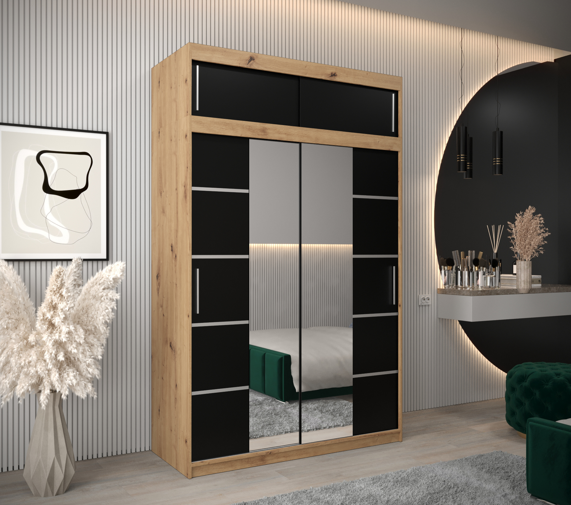 Šatní skříň Abi V4 s nástavcem Hledáte moderní šatní skříň s posuvnými dveřmi, která vás okouzlí svým originálním vzhledem? Nehledejte nic jiného než šatní skříň Abi V4 s nástavcem! Šatní skříň nabízí velký úložný prostor a kvalitu. Můžete si vybrat z několika velikostí a barev, takže se skříň přizpůsobí vašim potřebám. • Vlastnosti šatní skříně Korpus a posuvné dveře Korpus a dveře jsou vyrobeny z kvalitní laminované dřevotřískové desky o síle 16 mm. PVC hrany Hrany desek jsou opatřeny PVC dýhou o síle 0,5 mm Ozdobné pásky Posuvné dveře jsou zdobené stříbrnými plastovými pásky, které je nutno při montáži nalepit. Zrcadlo Na dveřích vám bude k dispozici leštěné zrcadlo. Úchyty k otevření šatní skříně vám poslouží plastové stříbrné úchyty. Vnitřní uspořádání Základem vnitřního uspořádání jsou dvě šatní šatní a police - lze si dokoupit zásuvky. • Barevné varianty: Šatní skříň Abi V4 s nástavcem je dostupná v dekorech a barvách dub artisan, dub sonoma, černá a bílá. Všechny tyto odstíny lze vzájemně kombinovat. dub artisan dub sonoma černá bílá • Rozměry 240 cm celková výška 6 rozměrů celková šířka 62 cm celková hloubka 16 mm tloušťka desky 6 rozměrů šířka 100 cmšířka 120 cmšířka 150 cmšířka 180 cmšířka 200 cmšířka 250 cm Detailní rozpis jednotlivých balíků při přepravěV odkazu níže naleznete podrobnosti týkající se počtu balíků, jejich rozměry a váhuRozpis jednotlivých balíků • ZásuvkyPraktické rozšíření univerzální a stylové skříně Abi o nástavec se zásuvkami. Elegantní rozšíření se dvěma, nebo od šířky 180 cm, dokonce se čtyřmi šuplíky je ideální pro rozšíření skříně o další úložný prostor. Barevné provedení zásuvek je stejné jako korpus šatní skříně. vnitřní uspořádání do šířky 150 cm rozšíření o šuplíky u šířky do 150 cm vnitřní uspořádání od šířky 180 cm rozšíření o šuplíky od šířky 180 cm • Další modely šatních skříní z řady AbiZaujala Vás tato šatní skříň, ale představovali by jste si jiný rozměr, barevnou kombinaci nebo variantu zrcadla? Jedním kliknutím na odkaz níže se vám nabídnou další šatní skříně. A další výhodou těchto šatních skříní je i možnost dokoupení nástavců. Zobrazit další modely... • Další součásti ložniceVybavujete nový byt nebo chcete obměnit svůj stávají nábytek v ložnici? Postel je středem veškerého dění v místnosti. V naší nabídce naleznete veškeré komponenty ložnice.Zobrazit další nábytek.... • Upozornění Odstíny prezentované na fotografiích jsou ilustračním materiálem, barvy se mohou lišit od vyobrazení na fotografiích podle nastavení vašeho zobrazovacího zařízení. Zboží dodáváme vlastní dopravou! Zboží rozvážíme také o víkendu. Dodáváme v demontu s podrobným instruktážním návodem. Objednat si také můžete naše doplňkové služby jako je montáž na místě, výnos do patra a nebo ekologickou likvidaci starého nábytku. Zájem o služby přidejte do košíku v objednávce. Ceník doplňkových služeb - výnos, ekolikvidace a montáž Montáž na místě Pokud se nechcete trápit s montáží, rádi Vám sestavíme nábytek na místě Výnos až do bytu Nechcete se tahat se zakoupeným zbožím? Rádi vám nábytek vyneseme až do bytu. Doprava Paul nábytek Zboží vám dopravíme až k domu naší vlastní dopravou, aby nedošlo k poškození cizím dopravcem. Ekologická likvidace Pokud si přejete, můžeme odvést starý nábytek a ekologicky jej nechat zlikvidovat. Zboží dodáváme po celé České republice! Dodáváme v demontu s podrobným instruktážním návodem. Objednat si také můžete naše doplňkové služby jako je montáž na místě, výnos do patra nebo ekologickou likvidaci starého nábytku. Požadované služby přidejte do košíku v objednávce. Montáž na místě Pokud se nechcete trápit s montáží, rádi Vám sestavíme nábytek na místě Výnos až do bytu Nechcete se tahat se zakoupeným zbožím? Rádi vám nábytek vyneseme až do bytu. Doprava ČR Zboží vám dopravíme až k domu za první uzamykatelné dveře po celé České republice. Ekologická likvidace Pokud si přejete, můžeme odvést starý nábytek a ekologicky jej nechat zlikvidovat. Ceník doplňkových služeb - výnos, ekolikvidace a montáž Upozornění Produkty prezentované na fotografiích jsou ilustračním materiálem, barvy se mohou lišit od vyobrazení na fotografiích podle nastavení vašeho zobrazovacího zařízení.