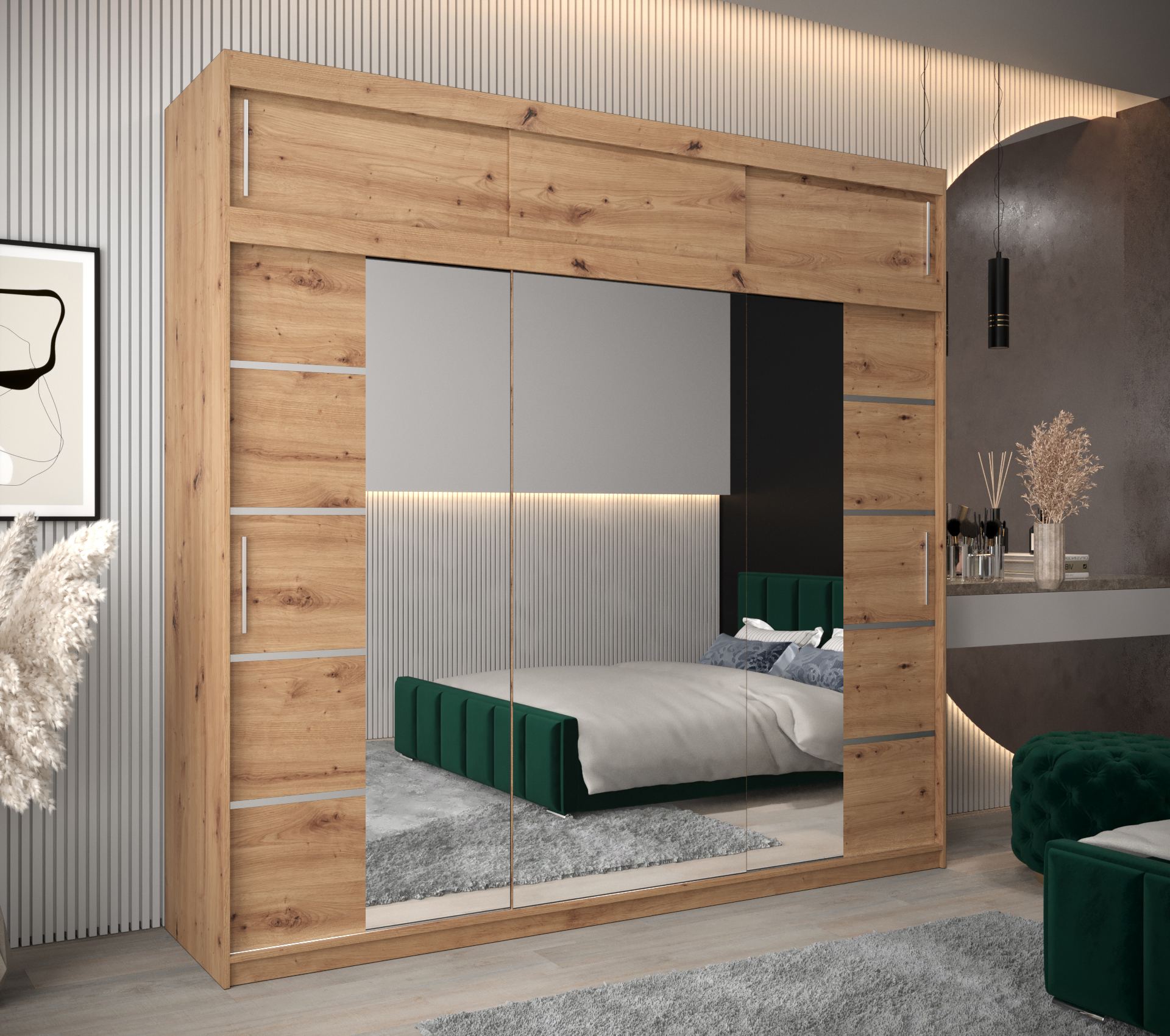 Šatní skříň Abi V4 s nástavcem Hledáte moderní šatní skříň s posuvnými dveřmi, která vás okouzlí svým originálním vzhledem? Nehledejte nic jiného než šatní skříň Abi V4 s nástavcem! Šatní skříň nabízí velký úložný prostor a kvalitu. Můžete si vybrat z několika velikostí a barev, takže se skříň přizpůsobí vašim potřebám. • Vlastnosti šatní skříně Korpus a posuvné dveře Korpus a dveře jsou vyrobeny z kvalitní laminované dřevotřískové desky o síle 16 mm. PVC hrany Hrany desek jsou opatřeny PVC dýhou o síle 0,5 mm Ozdobné pásky Posuvné dveře jsou zdobené stříbrnými plastovými pásky, které je nutno při montáži nalepit. Zrcadlo Na dveřích vám bude k dispozici leštěné zrcadlo. Úchyty k otevření šatní skříně vám poslouží plastové stříbrné úchyty. Vnitřní uspořádání Základem vnitřního uspořádání jsou dvě šatní šatní a police - lze si dokoupit zásuvky. • Barevné varianty: Šatní skříň Abi V4 s nástavcem je dostupná v dekorech a barvách dub artisan, dub sonoma, černá a bílá. Všechny tyto odstíny lze vzájemně kombinovat. dub artisan dub sonoma černá bílá • Rozměry 240 cm celková výška 6 rozměrů celková šířka 62 cm celková hloubka 16 mm tloušťka desky 6 rozměrů šířka 100 cmšířka 120 cmšířka 150 cmšířka 180 cmšířka 200 cmšířka 250 cm Detailní rozpis jednotlivých balíků při přepravěV odkazu níže naleznete podrobnosti týkající se počtu balíků, jejich rozměry a váhuRozpis jednotlivých balíků • ZásuvkyPraktické rozšíření univerzální a stylové skříně Abi o nástavec se zásuvkami. Elegantní rozšíření se dvěma, nebo od šířky 180 cm, dokonce se čtyřmi šuplíky je ideální pro rozšíření skříně o další úložný prostor. Barevné provedení zásuvek je stejné jako korpus šatní skříně. vnitřní uspořádání do šířky 150 cm rozšíření o šuplíky u šířky do 150 cm vnitřní uspořádání od šířky 180 cm rozšíření o šuplíky od šířky 180 cm • Další modely šatních skříní z řady AbiZaujala Vás tato šatní skříň, ale představovali by jste si jiný rozměr, barevnou kombinaci nebo variantu zrcadla? Jedním kliknutím na odkaz níže se vám nabídnou další šatní skříně. A další výhodou těchto šatních skříní je i možnost dokoupení nástavců. Zobrazit další modely... • Další součásti ložniceVybavujete nový byt nebo chcete obměnit svůj stávají nábytek v ložnici? Postel je středem veškerého dění v místnosti. V naší nabídce naleznete veškeré komponenty ložnice.Zobrazit další nábytek.... • Upozornění Odstíny prezentované na fotografiích jsou ilustračním materiálem, barvy se mohou lišit od vyobrazení na fotografiích podle nastavení vašeho zobrazovacího zařízení. Zboží dodáváme vlastní dopravou! Zboží rozvážíme také o víkendu. Dodáváme v demontu s podrobným instruktážním návodem. Objednat si také můžete naše doplňkové služby jako je montáž na místě, výnos do patra a nebo ekologickou likvidaci starého nábytku. Zájem o služby přidejte do košíku v objednávce. Ceník doplňkových služeb - výnos, ekolikvidace a montáž Montáž na místě Pokud se nechcete trápit s montáží, rádi Vám sestavíme nábytek na místě Výnos až do bytu Nechcete se tahat se zakoupeným zbožím? Rádi vám nábytek vyneseme až do bytu. Doprava Paul nábytek Zboží vám dopravíme až k domu naší vlastní dopravou, aby nedošlo k poškození cizím dopravcem. Ekologická likvidace Pokud si přejete, můžeme odvést starý nábytek a ekologicky jej nechat zlikvidovat. Zboží dodáváme po celé České republice! Dodáváme v demontu s podrobným instruktážním návodem. Objednat si také můžete naše doplňkové služby jako je montáž na místě, výnos do patra nebo ekologickou likvidaci starého nábytku. Požadované služby přidejte do košíku v objednávce. Montáž na místě Pokud se nechcete trápit s montáží, rádi Vám sestavíme nábytek na místě Výnos až do bytu Nechcete se tahat se zakoupeným zbožím? Rádi vám nábytek vyneseme až do bytu. Doprava ČR Zboží vám dopravíme až k domu za první uzamykatelné dveře po celé České republice. Ekologická likvidace Pokud si přejete, můžeme odvést starý nábytek a ekologicky jej nechat zlikvidovat. Ceník doplňkových služeb - výnos, ekolikvidace a montáž Upozornění Produkty prezentované na fotografiích jsou ilustračním materiálem, barvy se mohou lišit od vyobrazení na fotografiích podle nastavení vašeho zobrazovacího zařízení.