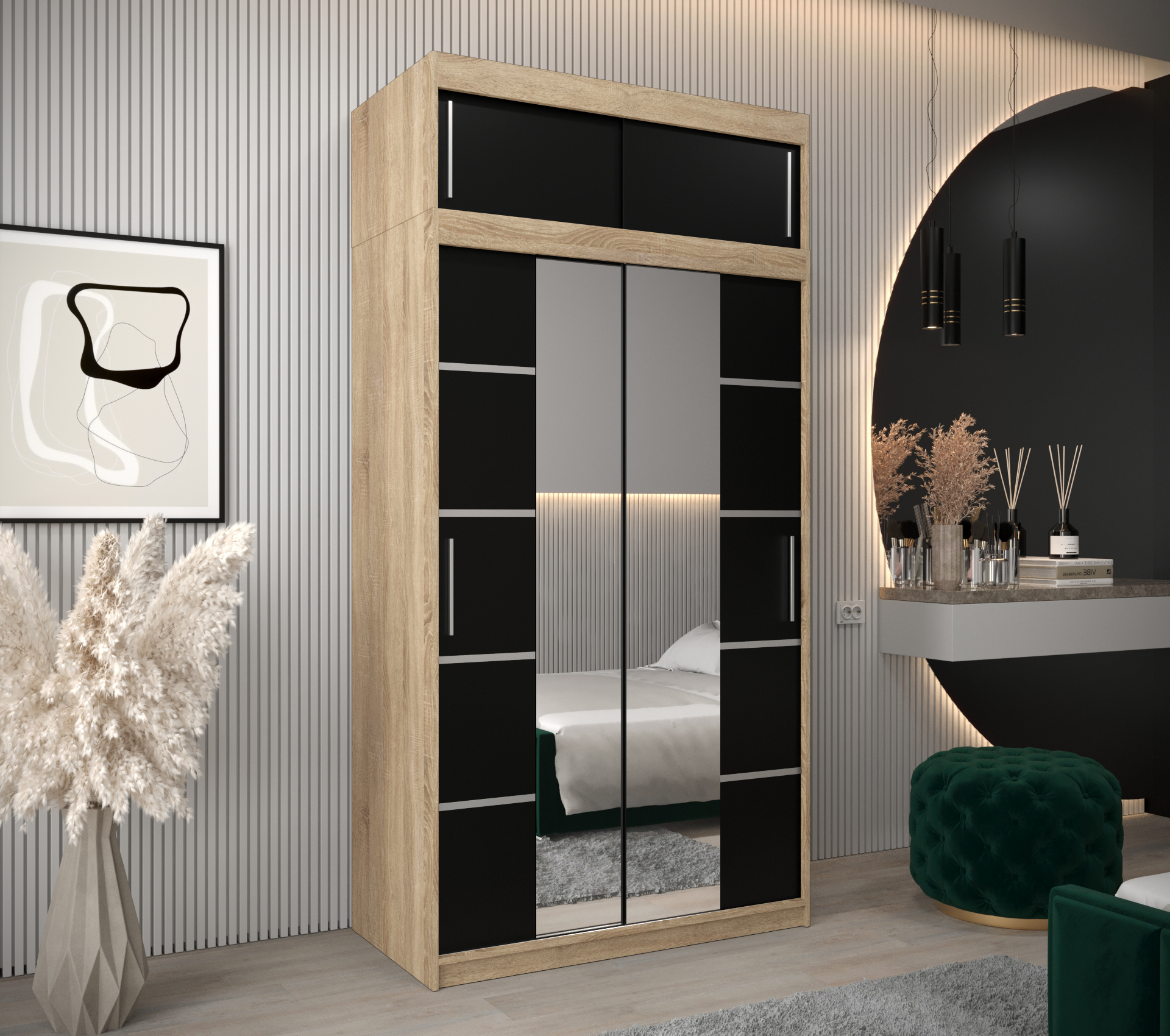 Šatní skříň Abi V4 s nástavcem Hledáte moderní šatní skříň s posuvnými dveřmi, která vás okouzlí svým originálním vzhledem? Nehledejte nic jiného než šatní skříň Abi V4 s nástavcem! Šatní skříň nabízí velký úložný prostor a kvalitu. Můžete si vybrat z několika velikostí a barev, takže se skříň přizpůsobí vašim potřebám. • Vlastnosti šatní skříně Korpus a posuvné dveře Korpus a dveře jsou vyrobeny z kvalitní laminované dřevotřískové desky o síle 16 mm. PVC hrany Hrany desek jsou opatřeny PVC dýhou o síle 0,5 mm Ozdobné pásky Posuvné dveře jsou zdobené stříbrnými plastovými pásky, které je nutno při montáži nalepit. Zrcadlo Na dveřích vám bude k dispozici leštěné zrcadlo. Úchyty k otevření šatní skříně vám poslouží plastové stříbrné úchyty. Vnitřní uspořádání Základem vnitřního uspořádání jsou dvě šatní šatní a police - lze si dokoupit zásuvky. • Barevné varianty: Šatní skříň Abi V4 s nástavcem je dostupná v dekorech a barvách dub artisan, dub sonoma, černá a bílá. Všechny tyto odstíny lze vzájemně kombinovat. dub artisan dub sonoma černá bílá • Rozměry 240 cm celková výška 6 rozměrů celková šířka 62 cm celková hloubka 16 mm tloušťka desky 6 rozměrů šířka 100 cmšířka 120 cmšířka 150 cmšířka 180 cmšířka 200 cmšířka 250 cm Detailní rozpis jednotlivých balíků při přepravěV odkazu níže naleznete podrobnosti týkající se počtu balíků, jejich rozměry a váhuRozpis jednotlivých balíků • ZásuvkyPraktické rozšíření univerzální a stylové skříně Abi o nástavec se zásuvkami. Elegantní rozšíření se dvěma, nebo od šířky 180 cm, dokonce se čtyřmi šuplíky je ideální pro rozšíření skříně o další úložný prostor. Barevné provedení zásuvek je stejné jako korpus šatní skříně. vnitřní uspořádání do šířky 150 cm rozšíření o šuplíky u šířky do 150 cm vnitřní uspořádání od šířky 180 cm rozšíření o šuplíky od šířky 180 cm • Další modely šatních skříní z řady AbiZaujala Vás tato šatní skříň, ale představovali by jste si jiný rozměr, barevnou kombinaci nebo variantu zrcadla? Jedním kliknutím na odkaz níže se vám nabídnou další šatní skříně. A další výhodou těchto šatních skříní je i možnost dokoupení nástavců. Zobrazit další modely... • Další součásti ložniceVybavujete nový byt nebo chcete obměnit svůj stávají nábytek v ložnici? Postel je středem veškerého dění v místnosti. V naší nabídce naleznete veškeré komponenty ložnice.Zobrazit další nábytek.... • Upozornění Odstíny prezentované na fotografiích jsou ilustračním materiálem, barvy se mohou lišit od vyobrazení na fotografiích podle nastavení vašeho zobrazovacího zařízení. Zboží dodáváme vlastní dopravou! Zboží rozvážíme také o víkendu. Dodáváme v demontu s podrobným instruktážním návodem. Objednat si také můžete naše doplňkové služby jako je montáž na místě, výnos do patra a nebo ekologickou likvidaci starého nábytku. Zájem o služby přidejte do košíku v objednávce. Ceník doplňkových služeb - výnos, ekolikvidace a montáž Montáž na místě Pokud se nechcete trápit s montáží, rádi Vám sestavíme nábytek na místě Výnos až do bytu Nechcete se tahat se zakoupeným zbožím? Rádi vám nábytek vyneseme až do bytu. Doprava Paul nábytek Zboží vám dopravíme až k domu naší vlastní dopravou, aby nedošlo k poškození cizím dopravcem. Ekologická likvidace Pokud si přejete, můžeme odvést starý nábytek a ekologicky jej nechat zlikvidovat. Zboží dodáváme po celé České republice! Dodáváme v demontu s podrobným instruktážním návodem. Objednat si také můžete naše doplňkové služby jako je montáž na místě, výnos do patra nebo ekologickou likvidaci starého nábytku. Požadované služby přidejte do košíku v objednávce. Montáž na místě Pokud se nechcete trápit s montáží, rádi Vám sestavíme nábytek na místě Výnos až do bytu Nechcete se tahat se zakoupeným zbožím? Rádi vám nábytek vyneseme až do bytu. Doprava ČR Zboží vám dopravíme až k domu za první uzamykatelné dveře po celé České republice. Ekologická likvidace Pokud si přejete, můžeme odvést starý nábytek a ekologicky jej nechat zlikvidovat. Ceník doplňkových služeb - výnos, ekolikvidace a montáž Upozornění Produkty prezentované na fotografiích jsou ilustračním materiálem, barvy se mohou lišit od vyobrazení na fotografiích podle nastavení vašeho zobrazovacího zařízení.