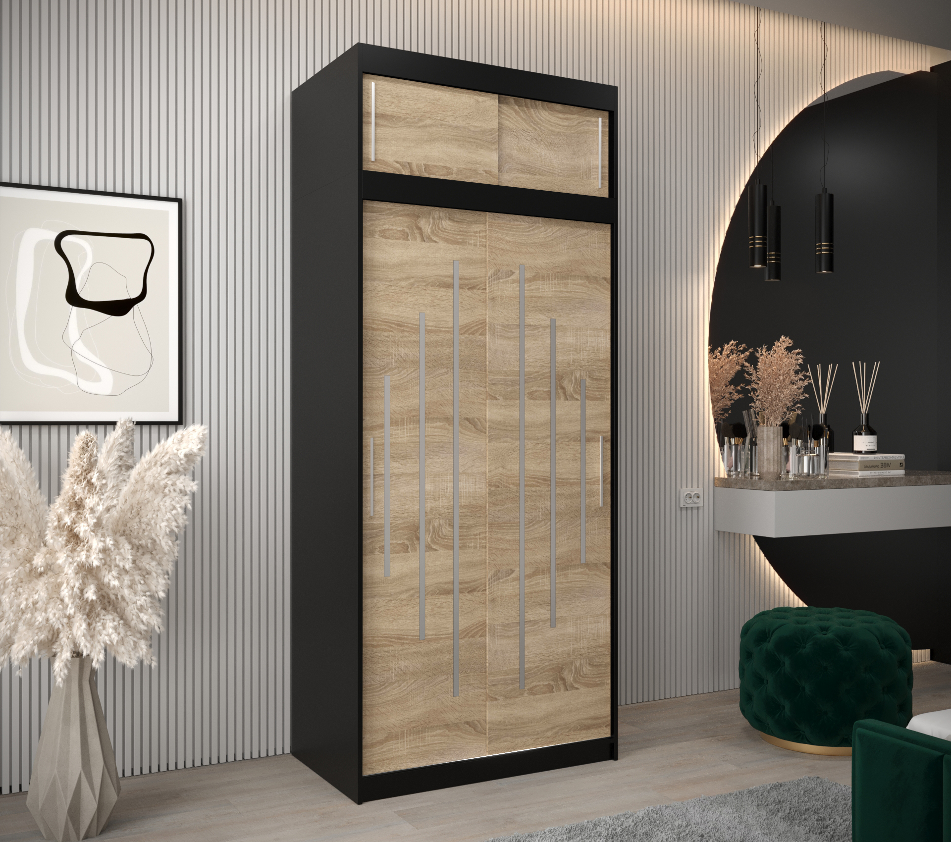 Domů Nábytek Ložnice Ložnicové sestavy Šatní skříň Abi Y0 s nástavcem Barva korpusu: Černá, Rozměry: 100 cm, Dveře: Dub sonoma