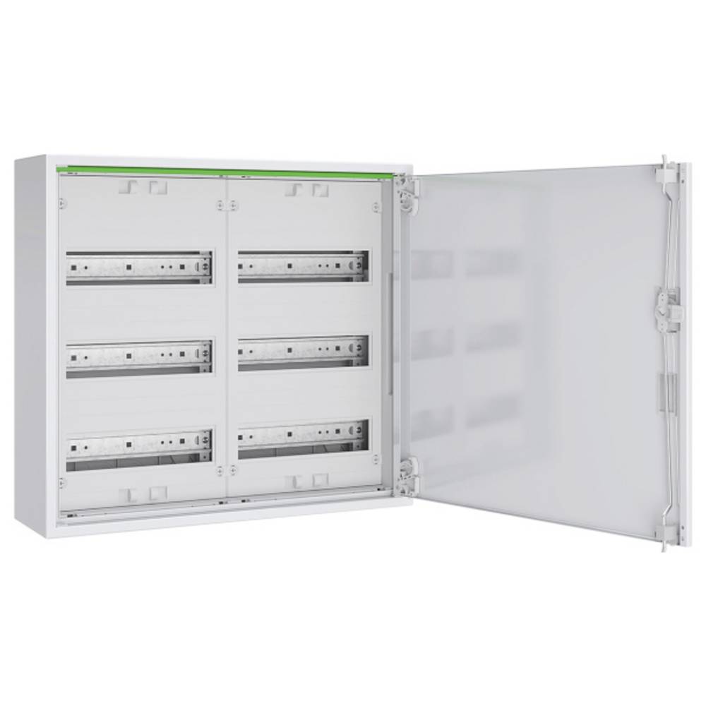 Kompletní skříň pro montáž na omítku se skládá z: RM pouzdro s kompletními dveřmi, 2x rozvodové pole 3 řady, 72 TE, pro zařízení pro montáž na lištu DIN, s PE/N svorkami, IP44