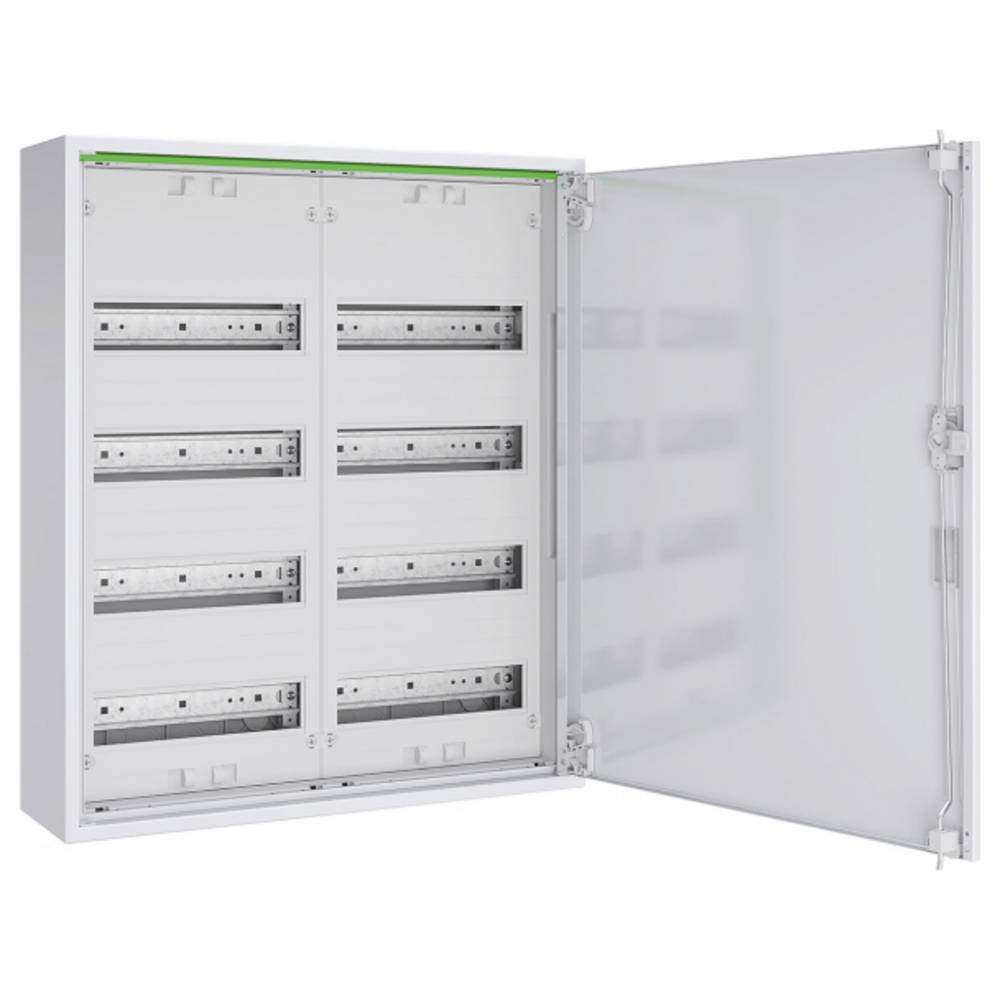 Kompletní skříň pro montáž na omítku se skládá z: RM pouzdro s kompletními dveřmi, 2x rozvodové pole 4 řady, 96 TE, pro zařízení pro montáž na lištu DIN, s PE/N svorkami, IP44