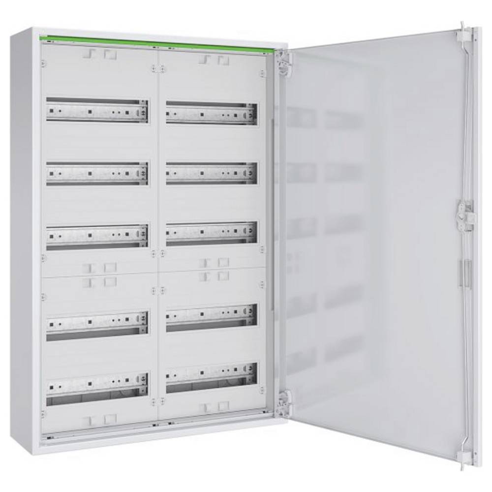 Kompletní skříň pro montáž na omítku se skládá z: RM pouzdro s kompletními dveřmi, 2x rozvodové pole 5 řady, 120 TE, pro zařízení pro montáž na lištu DIN, s PE/N svorkami, IP44