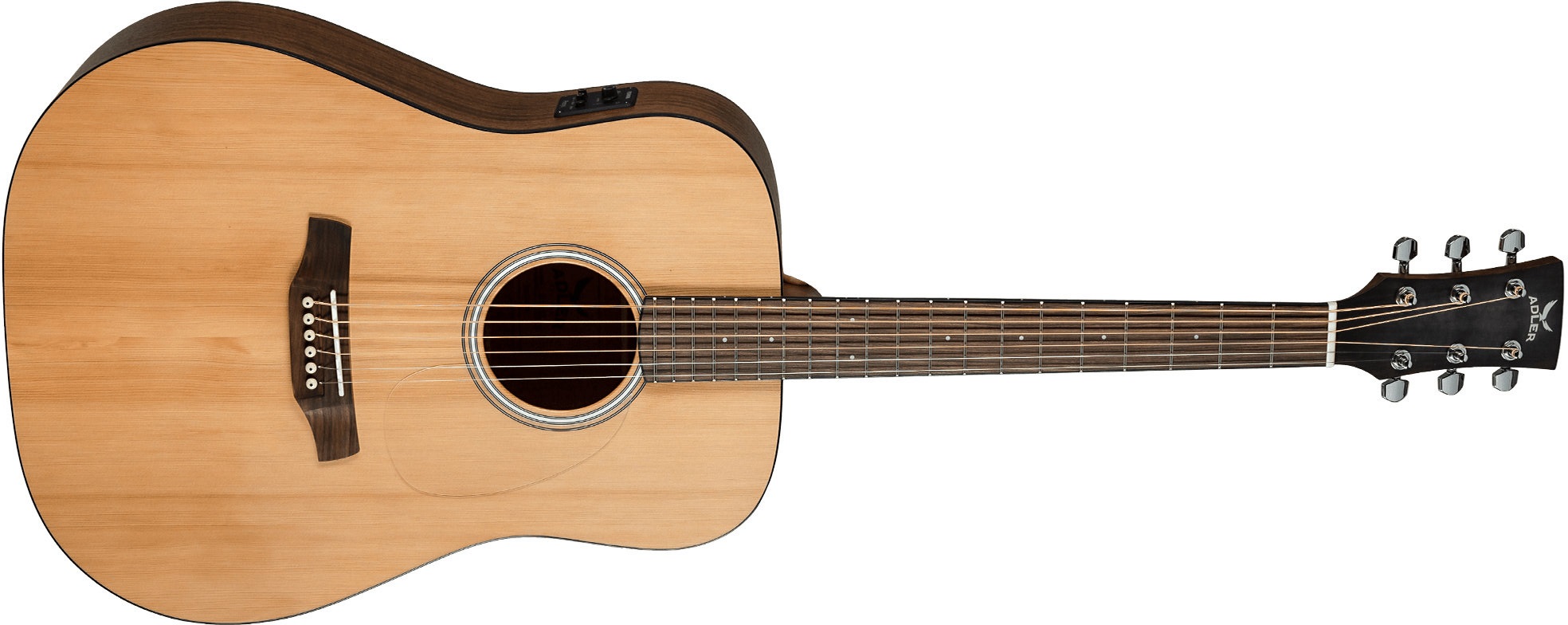 Elektroakustická kytara Elektroakustická kytara DE50-CM značky Adler Guitars je nástroj s velkým rezonantním tělem typu Dreadnought. Přední deska kytary je zhotovena z masivu cedru, zadní deska a luby jsou vyrobeny z vrstveného mahagonu. K mahagonovému krku je přilepen hmatník ze dřeva pau ferro. Orientaci na hmatníku usnadňují poziční tečky z imitace perleti. Možnost ozvučení nabízí elektronika Fishman Presys II s ovladače