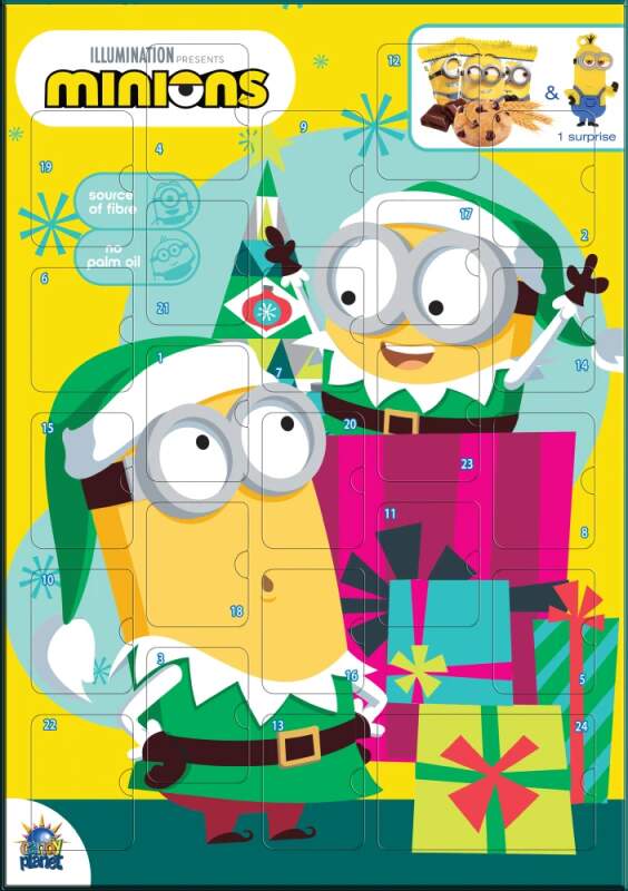 Adventní kalendář obsahuje 24 samostatně balených sušenek s motivem Mimoni a na štědrý den navíc překvapení (figurka nebo přívěšek). Krásné balení s motivem Mimoni 24x 5,5g sušenka s kousky čokolády Složení:pšeničná mouka, čokoládové kousky(cukr, kaková hmota, kakaové máslo, sójový lecitin), slunečnicový olej s vysokým obsahem kyseliny olejové, cukr, rostlinná vláknina (oligofruktoza), sušená syrovátka, kypřící látky (uhličitany sodné, uhličitany amoné), jedlá sůl, aromata, emulgátory (lecitin)