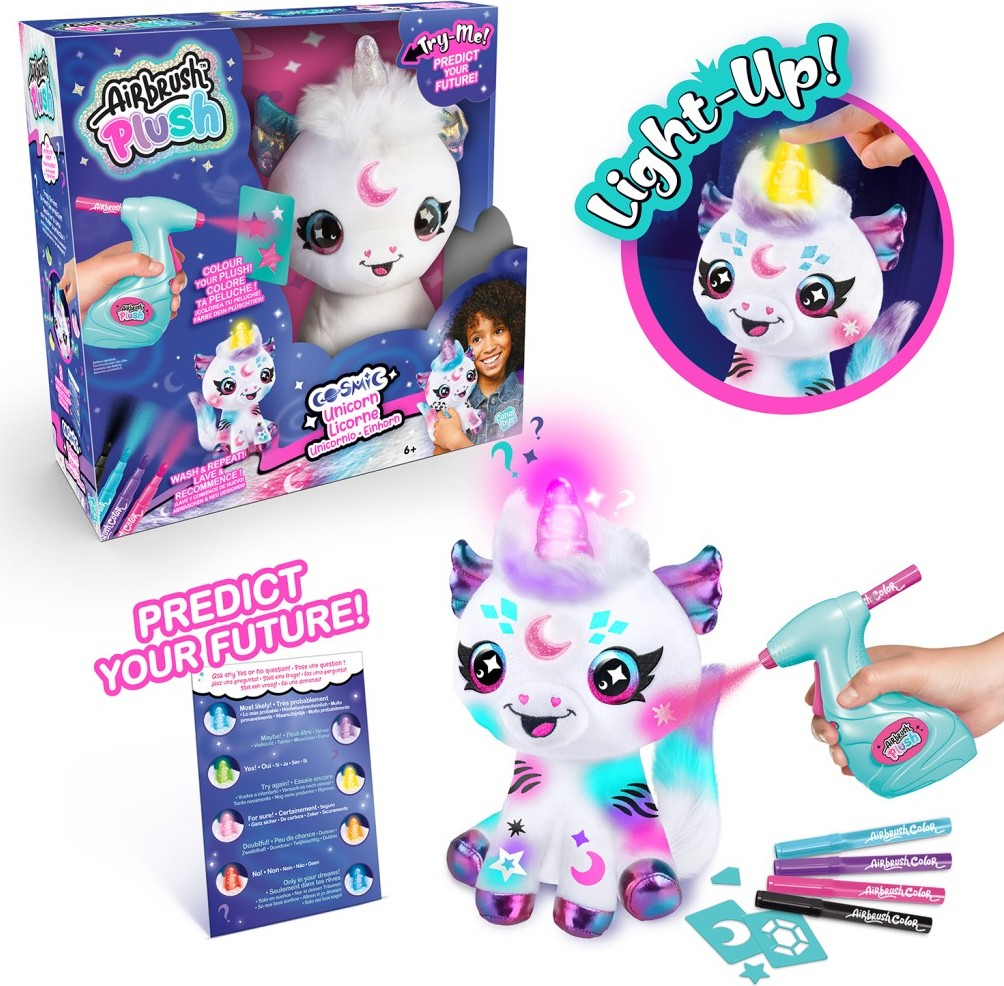 Navrhni a vybarvi si svého vesmírného jednorožce. Součástí tohoto balení je plyšové zvířátko, airbrush nástroj, 4 různé barevné náplně, 100 různých šablon a návod. Plyšové zvířátko si můžeš pomocí airbrushe libovolně posprejovat, můžeš využít různé barvy a šablony. Fantazii se meze nekladou. Pokud se ti vytvořený design přestane líbit, stačí plyšáka omýt vodou a můžeš začít znovu. Plyšákovi svítí kouzelný rok a může odpovědět díky barvě rohu na otázku ano-ne. Výrobek je vhodný pro děti od 6 let a vyžaduje 2× AA baterie, které nejsou součástí balení a 3 baterie LR44, jsou součástí.