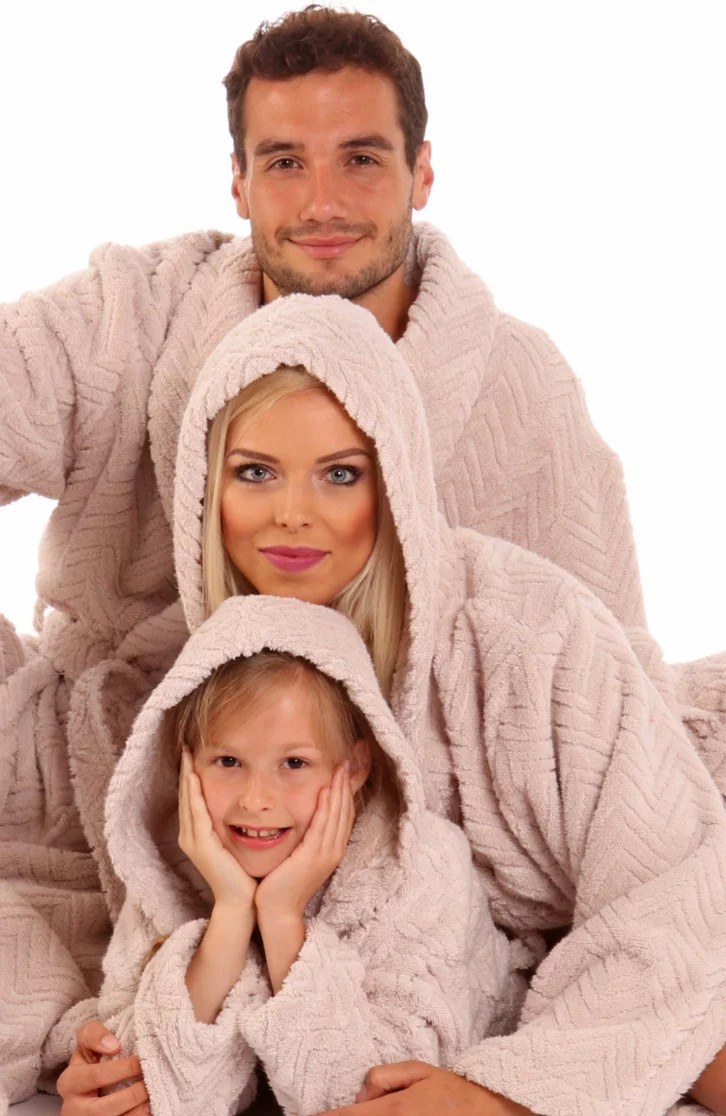 Dlouhý, teplý župan se šálovým límcem. V pase na zavazování Vroubkovaný vzor Materiálové složení: 100% microbavlna (froté), 500g/m2
