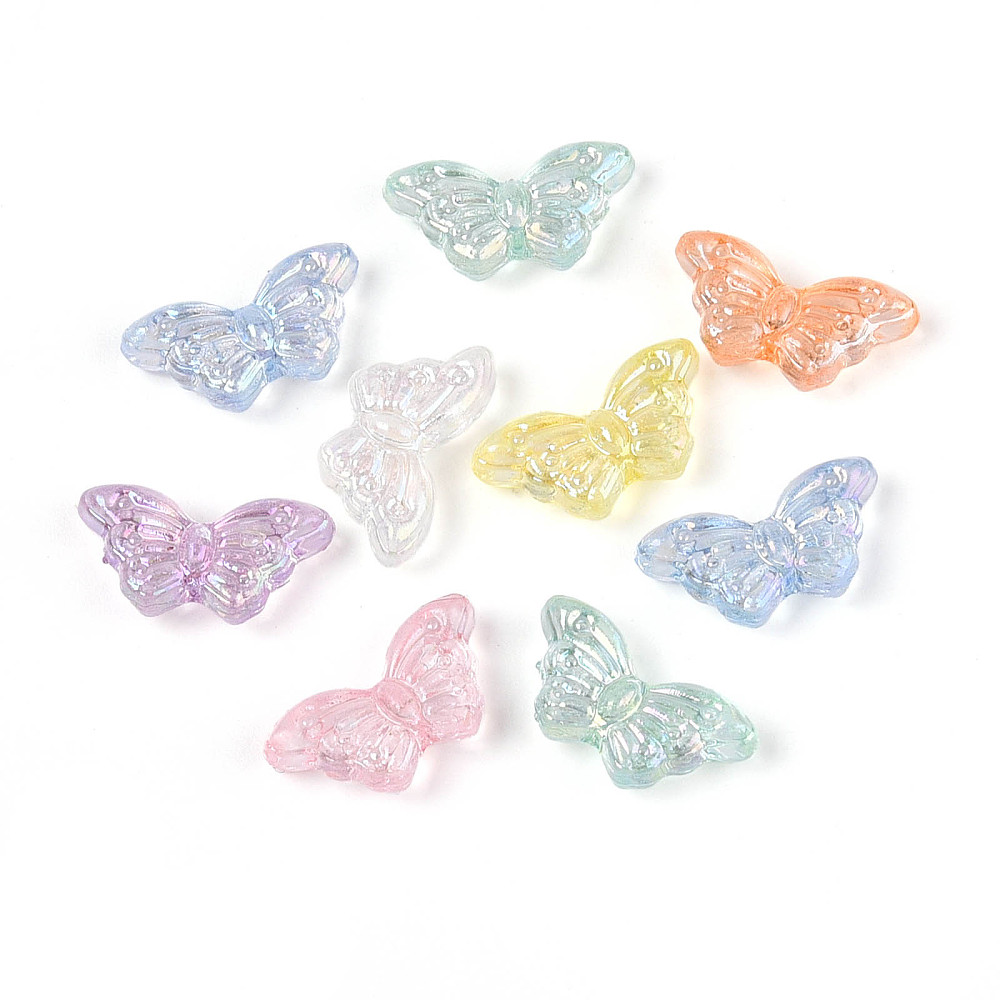 Akrylové korálky – motýlci, transparentní s duhovým povrchem (UV plating), mix barev Lehké a zářivé akrylové korálky ve tvaru motýlků s efektním duhovým povrchem. Díky UV pokovení se krásně třpytí a mění barvy podle dopadu světla. Skvěle se hodí pro výrobu náramků, náhrdelníků, náušnic i dekorací. Materiál: akryl (UV plating) Tvar: motýl Barva: mix transparentních duhových odstínů Velikost: cca 8 × 15 × 4,5 mm Průvlek: 1,2 mm Balení: 10 náhodně vybraných kusů Originální korálky, které dodají vašemu tvoření hravost a jemný třpyt.