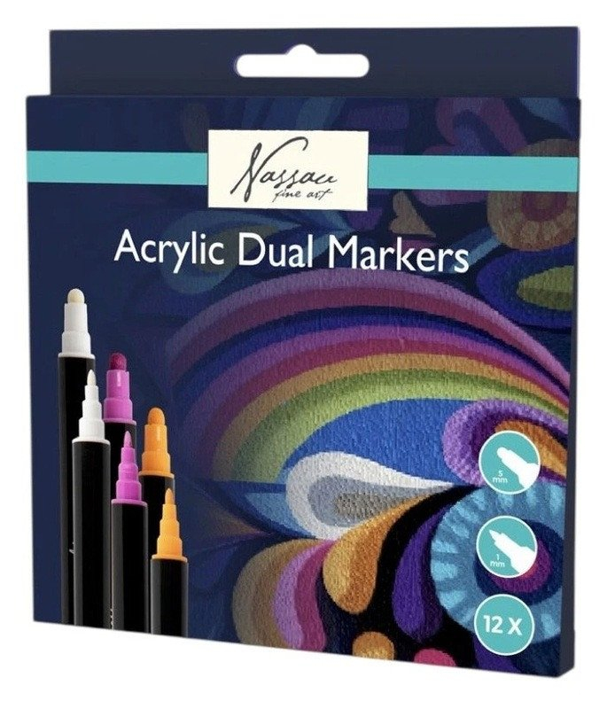 Sada 12 akrylových fixů s dvojitým hrotem (1 mm a 5 mm) nabízí syté, krycí barvy pro kreslení, dekorování a DIY projekty na různé povrchy.