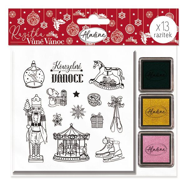 Tematická sada razítek potěší malé i velké a hlavně všechny, kteří se těší Vánoce a zimu. Balení je také vhodné pro školská zařízení. Sada obsahuje originální razítka s neotřelým designem a hlavně nápisy a texty v českém jazyce. Kromě razítek jsou součástí balení také podušky s inkoustem. Razítka lze použít při práci s papírem, kartonem, textilem, polymerem, keramikou a dalšími hmotami. Jednotlivá razítka jsou uložená v pěnové desce, kam se mohou po práci opět vrátit. Razítka se hodí jako krásný mikulášský a předvánoční dárek. Balení obsahuje 13 razítek a 3 podušky s barevným inkoustem. Upozornění: Razítka jsou dostupná ve více motivech - vybírejte podle obrázků, ne názvů (sada se sice jmenuje Vůně Vánoc, ale najdete v ní obrázek Louskáčka. Kakao a další voňavé věci najdete v sadě s názvem Louskáček, nevíme, proč to má firma Aladine nabalené opačně.)
