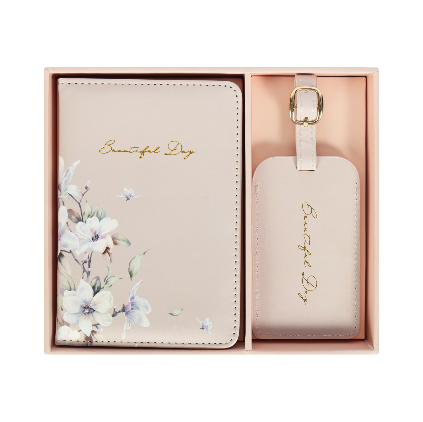 Cestovní sada s květinovým motivem obsahuje koženkové pouzdro na cestovní dokumenty a visačku na zavazadlo. Velikost balení: 19,5 × 16 × 2,5 cm