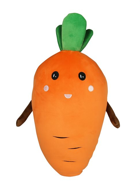 Heboučký polštář ve tvaru mrkve s roztomilým obličejem.