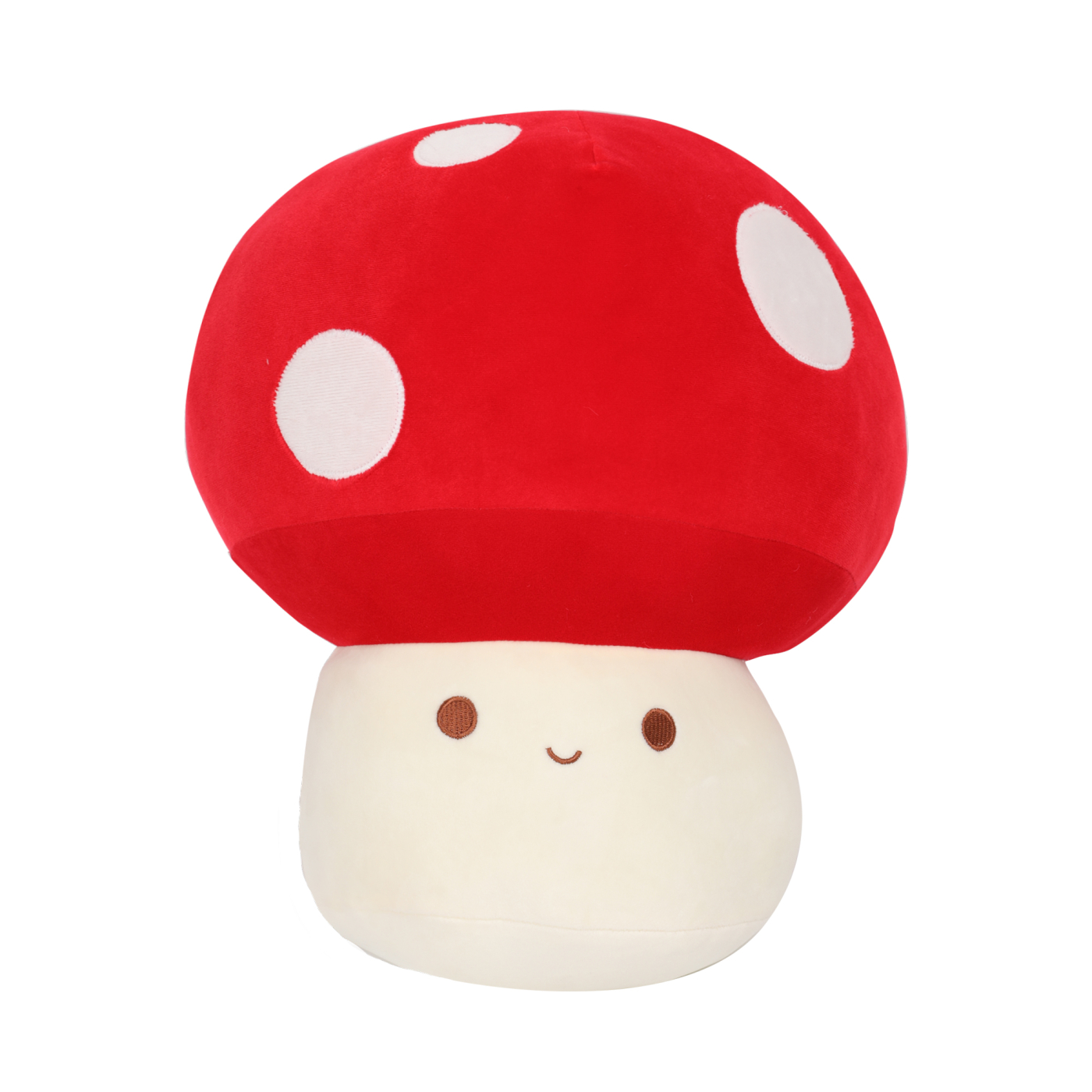 Heboučký polštář ve tvaru muchomůrky s roztomilým obličejem.