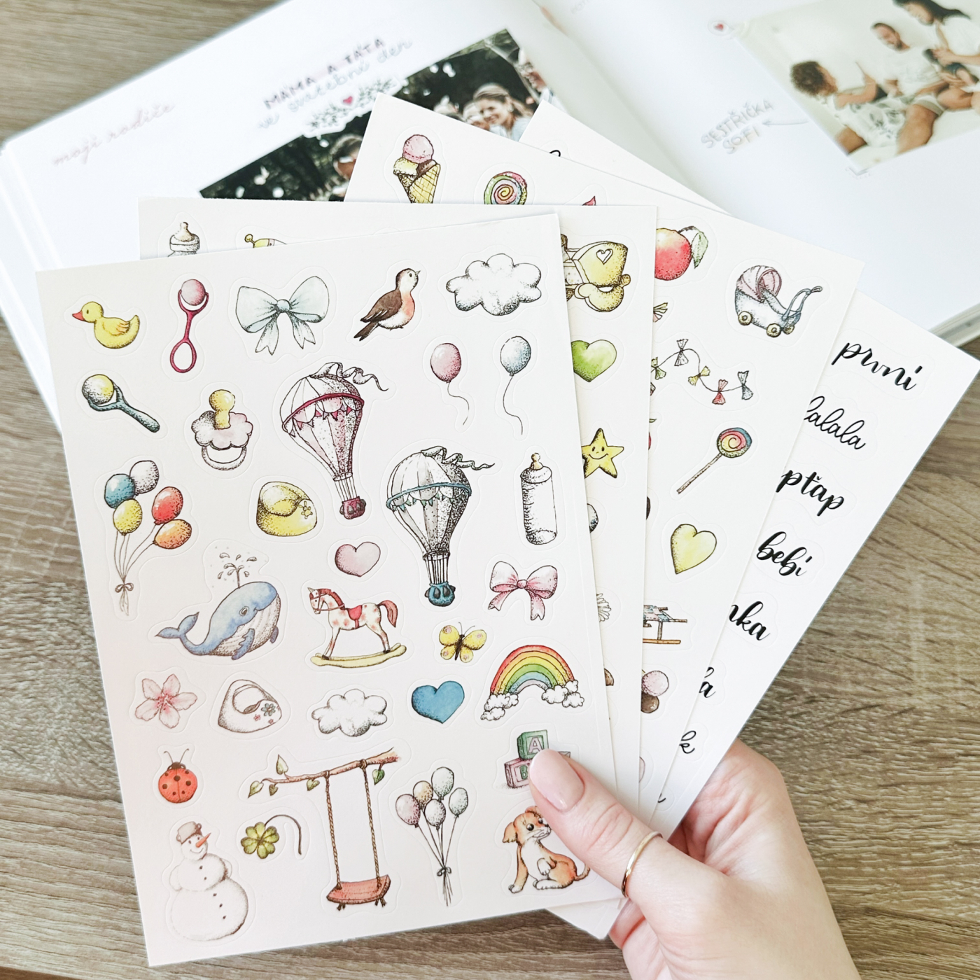 Samolepky pro dětské vzpomínky se stanou vaším neodmyslitelným pomocníkem pro kreativní tvoření. Nejlépe se hodí ke knize Mé první roky.