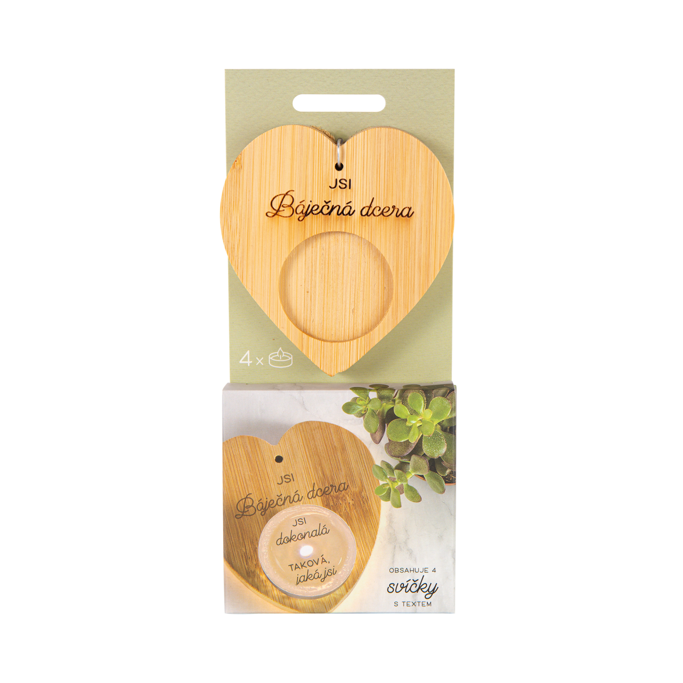 Dárkové balení svícnu s věnováním a 4 svíček s textem, který se objeví až po rozehřátí vosku.