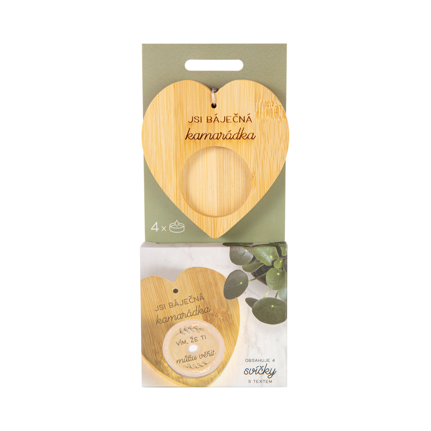 Dárkové balení svícnu s věnováním a 4 svíček s textem, který se objeví až po rozehřátí vosku.