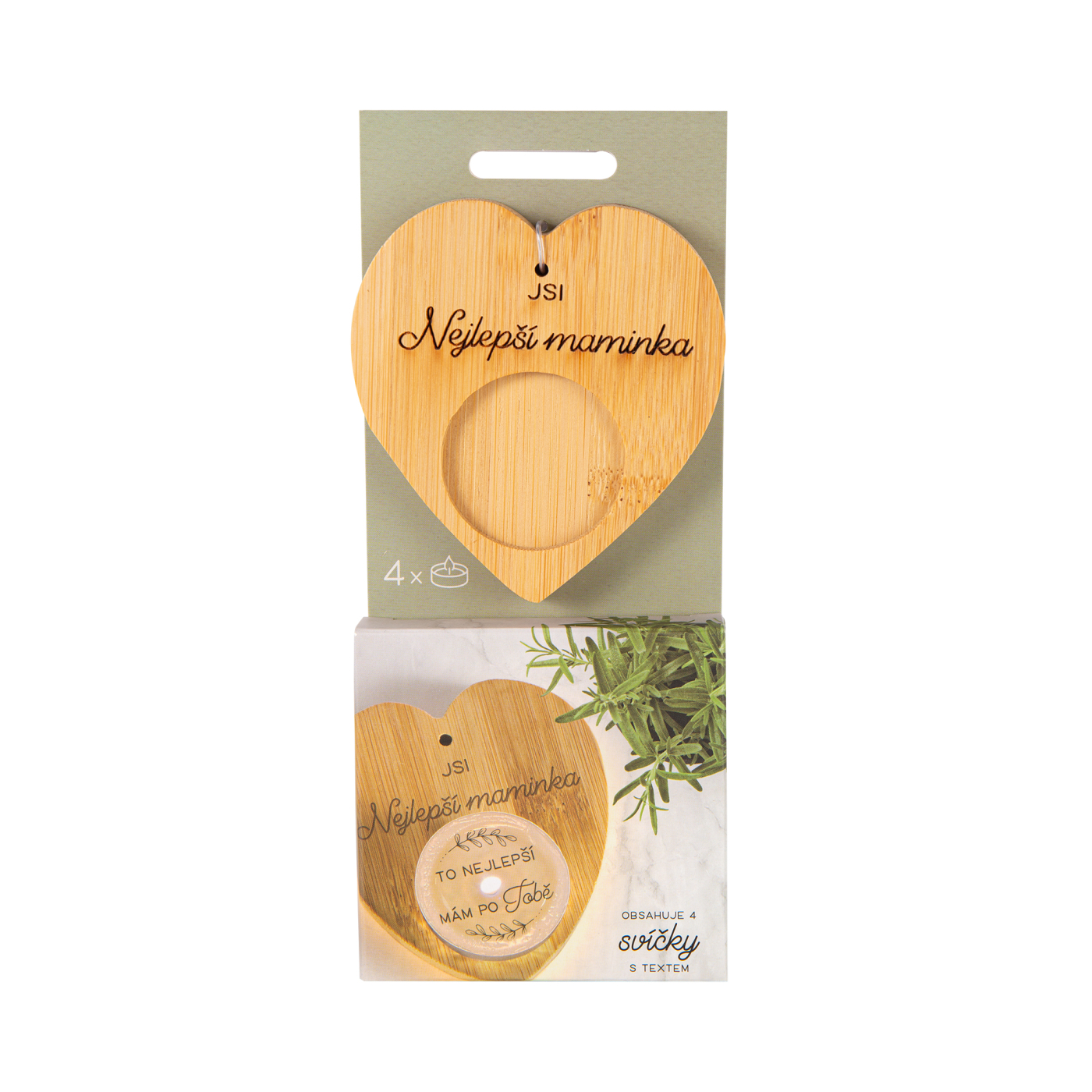 Dárkové balení svícnu s věnováním a 4 svíček s textem, který se objeví až po rozehřátí vosku.