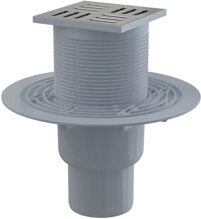 Podlahová vpust 105 × 105/50/75 přímá, mřížka nerez, vodní zápachová uzávěra masivní nerezová mřížka 105x105 mm možnost nastavení výšky vodní zápachová uzávěra odpadová trubka – průměr 50/75 mm