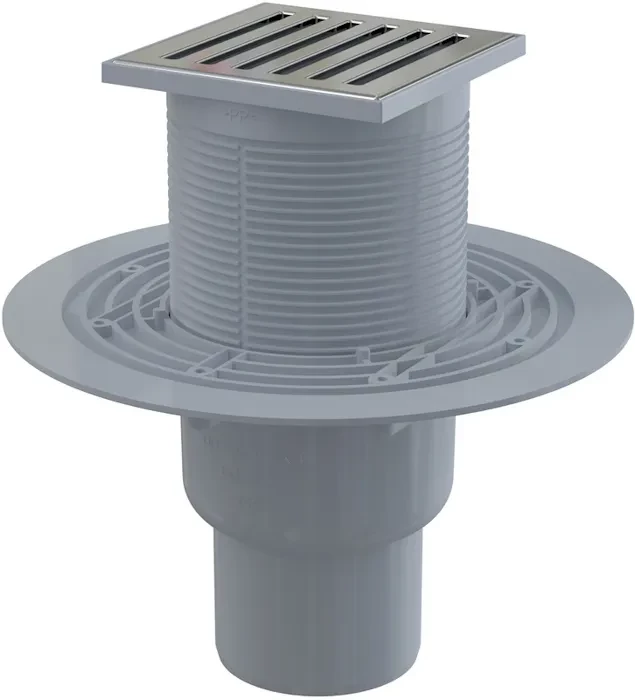 Podlahová vpust 105 × 105/50/75 přímá, mřížka nerez, vodní zápachová uzávěra masivní nerezová mřížka 105x105 mm možnost nastavení výšky vodní zápachová uzávěra odpadová trubka – průměr 50/75 mm