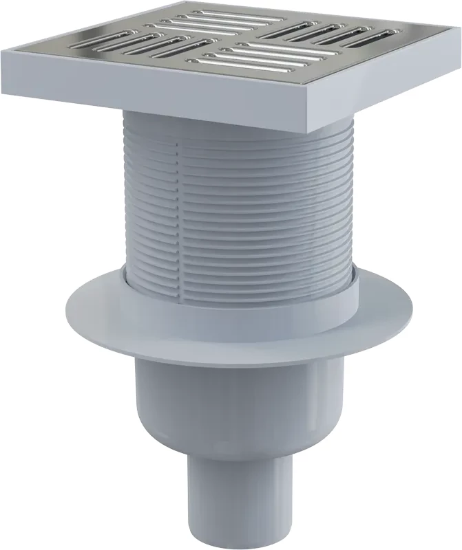 Alcaplast Podlahová vpust 150×150/50 mm přímá, mřížka nerez, vodní zápachová uzávěra APV6411; Vlastnosti: Nerezová mřížka 143x143x5 mm; Výškově upravitelné hrdlo 22-110 mm; Izolační límec pro napojení na hydroizolaci stavby; Přímé napojení na odpad 50 mm; Mechanicky čistitelný sifon až po odpadní trubku; Vodní zápachová uzávěra; Kompatibilita s dílci podlahových vpustí včetně vodní, suché a kombinované zápachové uzávěry SMART; Materiál: polypropylen odolný proti mechanickému, chemickému a tepelnému poškození; Použití: Pro vnitřní prostory, kde se předpokládá časté využívání spojené s pravidelným odtokem vody do vpusti (koupelny); Pro odvodnění v úrovni podlahy; Pro bezbariérový přístup; Technické parametry: Průtok s vtokovou mřížkou 46 l/min; Zápachová uzávěra vodní 51 mm; Odolnost zápachové uzávěry proti tlaku 480 Pa; Třída zatížení K3 300 kg; Rozsah dodávky: Tělo vpusti přímé 50 mm; Hrdlo vpusti 150x150 mm; Nerezová mřížka; Vodní zápachová uzávěra; Sada těsnění