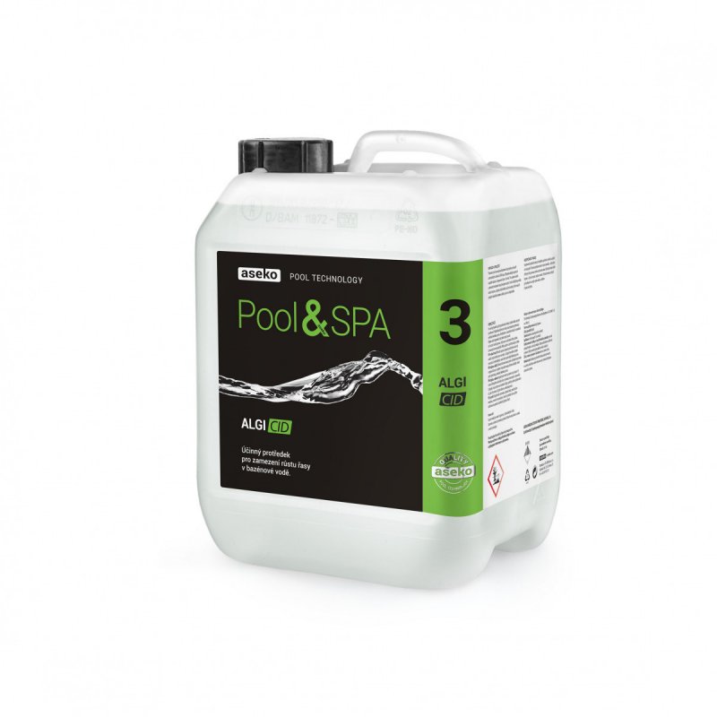 Algicid je ideální přípravek pro bazény a lázně, kde účinně a dlouhodobě zabraňuje růstu všech druhů řas. Je bez zápachu a díky své vysoké účinnosti zajistí křišťálově čistou vodu. Působí preventivně i při výskytu řas a je vhodný pro dávkování ručně i pomocí automatických zařízení.