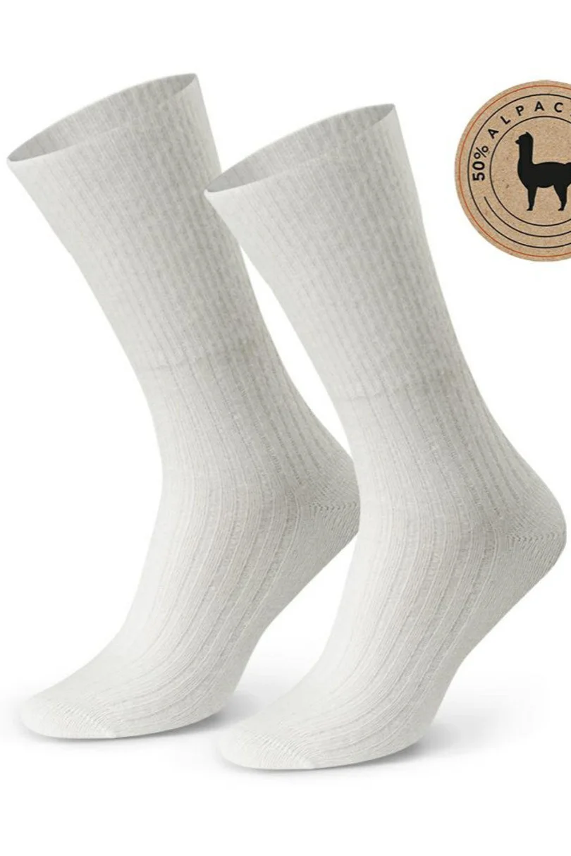 Ponožky s alpakovou vlnou, třikrát pevnější než ovčí vlna, neabsorbují pachyów, mají hypoalergenní a tepelně izolační vlastnosti. Jejich žebrovaná struktura zabraňuje zbytečnému tlaku na nohu..