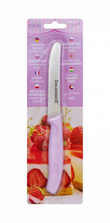 Alvarak Nerezový nůž vroubkovaný fialový 22 cm - Alvarak Nerezový nůž vroubkovaný fialový 22 cm z kategorie Dortisimo.cz | Pomůcky na pečení | Nože a struny na prořezávání dortů koupíte na Dortisimo.cz. EAN: 8590838190599