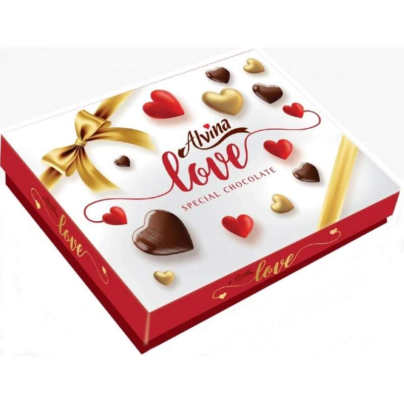 Alvina Hazelnut 210g Dárek od srdce pro nezapomenutelné okamžiky. Složení: kakaová cukrovinka (53%): cukr, rostlinný tuk (palmojádrový), sušená syrovátka, kakaový prášek, sušené odstředěné mléko, tekutá čokoláda (kakaová hmota + kakaové máslo), emulgátor (E322), vanilin, aroma (lískový ořech, čokoláda, mléko), mléčná náplň (47%): cukr, rostlinný palmový tuk,sušená syrovátka, sušené odstředěné mléko, emulgátor (E322), aroma (mléko, pomeranč, lískové oříšky, kokos, jahoda, karame, bobule, míchané ovoce) Může obsahovat stopy lepku a vajec.