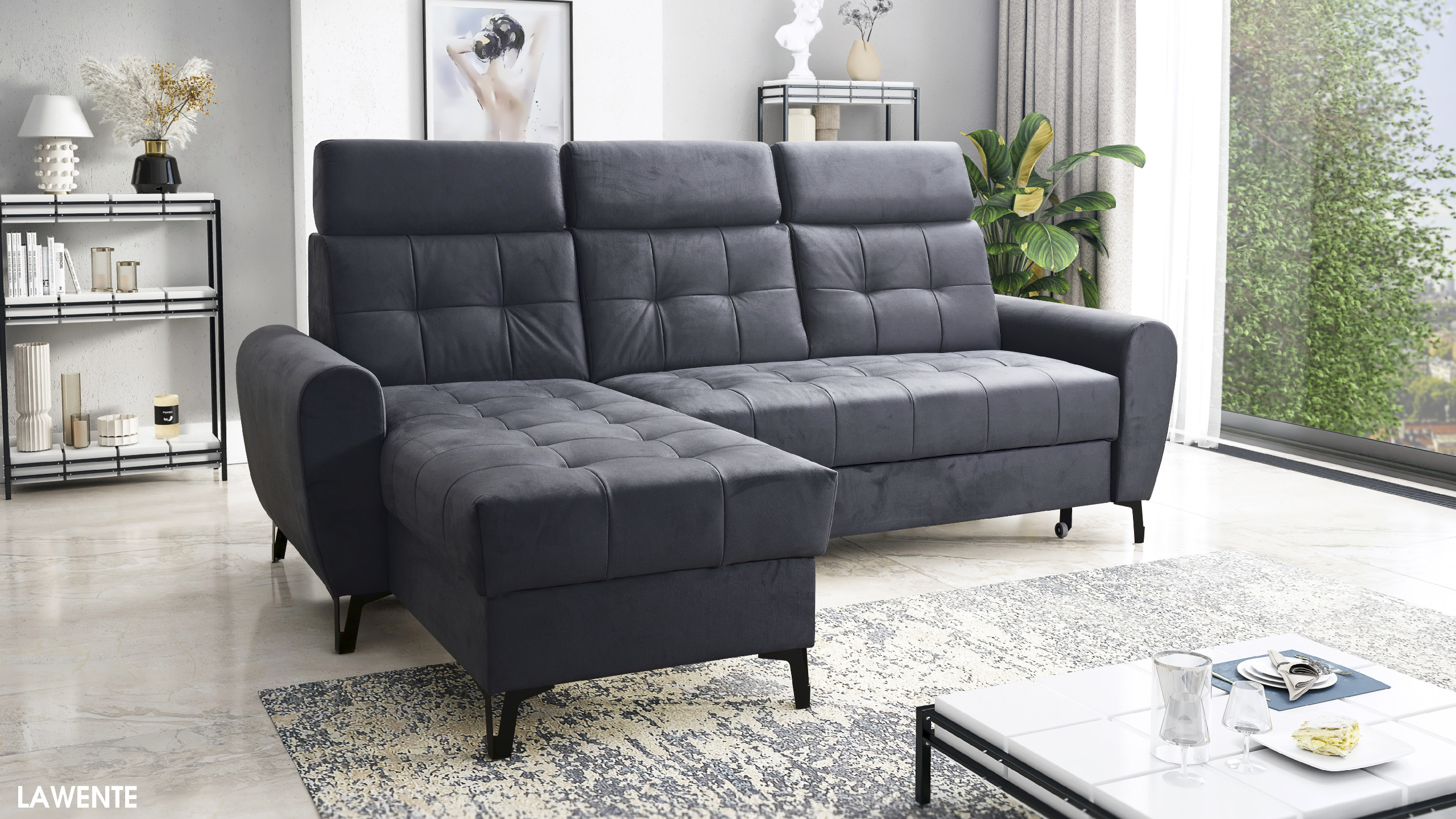 Sedací souprava Lawente Sedací souprava Lawente je moderní a kombinuje stylový design s funkčností, je tak ideálním řešením pro Váš obývací prostor. • Vlastnosti Možnost výběru levé a pravé stranyPUR PěnaPružiny typu BonellÚložný prostorRozkládací plocha ke spánkuKostra je tvořena kombinací měkkého a tvrdého dřevaČalouněná záda - lze umístit do prostoru místnosti • Kovové stabilní nožičky Celočalouněná záda Polohovací záhlavníky - 5 poloh Spolehlivý mechanismus k otevírání úložného prostoru • Rozklad na lůžko Přeměna sedačky na pohodlné lůžko je snadná a rychlá díky jednoduchému rozkládacímu mechanismu. Samotná rozkládací část je diskrétně ukryta ve výsuvném šuplíku. Když ji vytáhnete a zvednete za madlo, vytvoří se dostatečně velká plocha pro pohodlný odpočinek. • Úložný prostorSedací souprava disponuje praktickým úložným prostorem umístěným pod otomanem. Tento prostor nabízí dostatek místa pro uskladnění věcí.  • Polohovací opěrky hlavySedací souprava je vybavena třemi polohovacími opěrkami za hlavou. Manipulace je snadná a jednoduchá díky kvalitnímu sklopnému mechanismu.  • Rozměry 240 cm celková šířka 110 cm  výška s opěrkami hlavy 162 cm celková hloubka 123x206 cm plocha na spaní 74 cm šířka otomanu 85 cm Výška bez opěrek hlavy 55 cm hloubka sedáku 47 cm výška sedu 12 cm výška nožek • Potahová látka RicoPotahovou látku Rico řadíme mezi velurové tkaniny. Je jemná a hladká na dotek,  odolná vůči slunečnímu záření, díky čemuž si zachovává barevnost a sytost.  Je vyrobená z 92 % polyesteru a 8 % nylonu.Kompletní vzorník potahové látky Rico Látka Rico 01 Látka Rico 02 Látka Rico 03 Látka Rico 04 • Potahová látka CountryCOUNTRY – potahová látka měkká na dotek, odolná vůči slunečnímu záření a žmolkování. Syté, tlumené barvy, které ladí se současnými trendy. Látka je 100% recyklovatelná. Materiál se skvěle hodí jako doplněk k různým aranžmá v klasických i moderních interiérech, stejně jako na nábytek, pohovky, křesla, pohovky, židle, čela postelí.Kompletní vzorník potahové látky Country Country 03 Country 11 Country 15 Country 18 • •